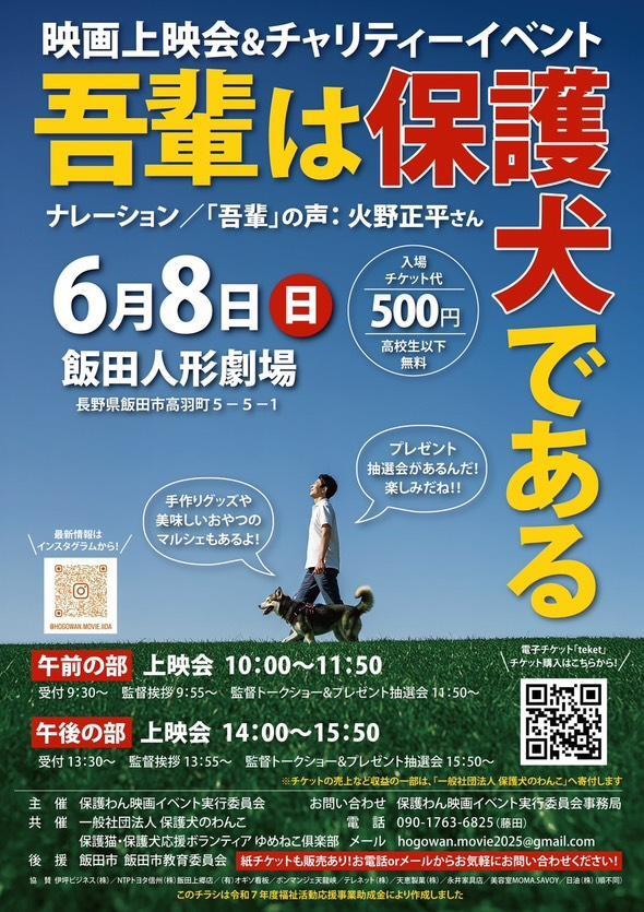 映画『吾輩は保護犬である』は、2025年6月8日(日)に飯田人形劇場で上映されます。ナレーションと「吾輩」役を務めるのは、俳優の火野正平さん。