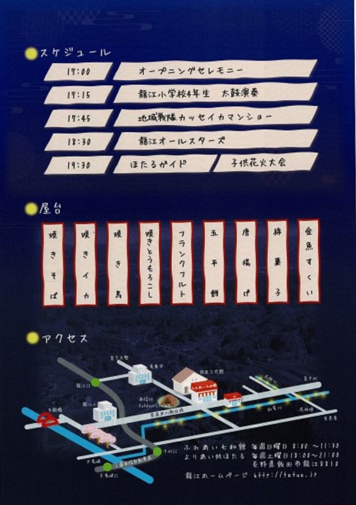 地元の小学生さんによる太鼓演奏や、地域戦隊カッセイカマンショーなど17時台から盛り上がりそうですね。屋台のメニューも、見ているだけで楽しい気分になりそうなお祭りらしい雰囲気の内容。