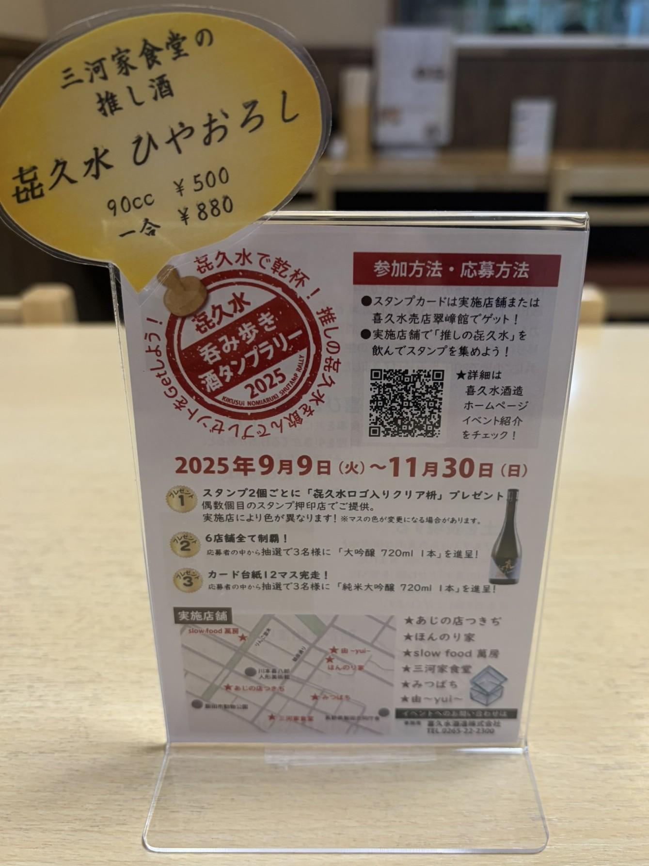 飯田市唯一の酒蔵・喜久水酒造の協力のもと、参加店それぞれが“自分の店らしい一杯”を提案。三河家では秋限定の「ひやおろし(90cc税込500円、1合税込880円)」を呑むと、スタンプを押してもらうことができますよ。
