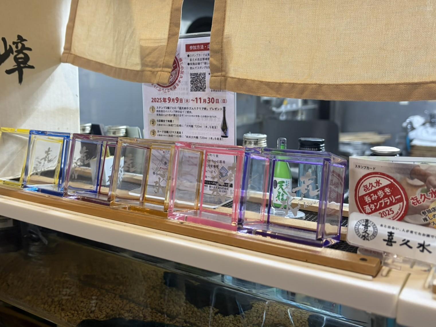 イベントでは、各店舗で㐂久水のお酒を注文すると、専用台紙にスタンプが押され、スタンプ2個ごとに「㐂久水(きくすい)ロゴ入りアクリル枡」がもらえます。