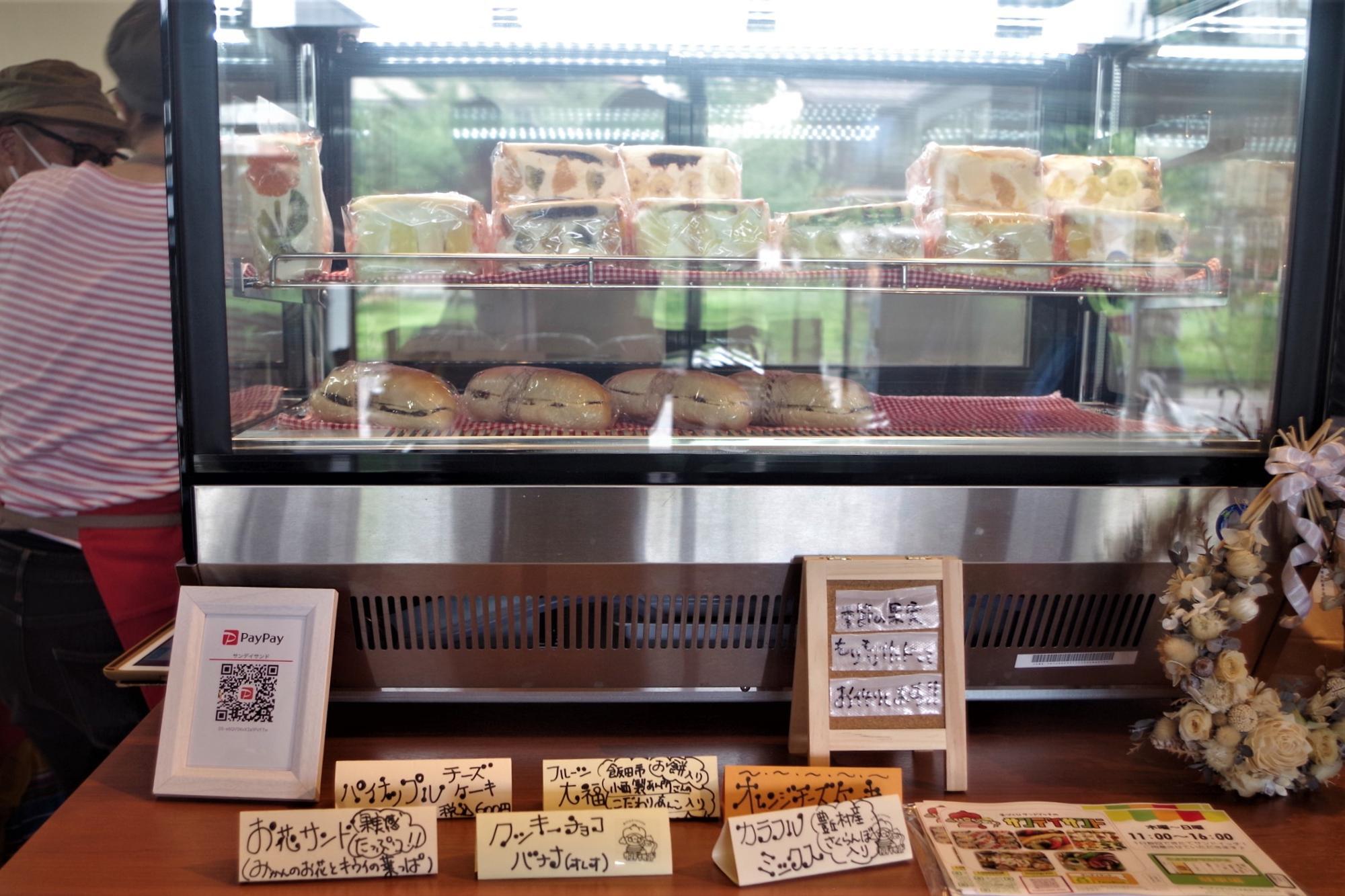 キュートでおいしそうな萌え断サンドが並んだサンデイサンドのショーケース。 みかんがまるっと入ったかわいいお花サンドや、オレオがはさまったクッキーチョコバナナ、北海道産小豆の粒あんとお餅(求肥)入りのフルーツ大福など、わくわくするようなサンドがずらり。どれを注文しようかとても迷ってしまいました。