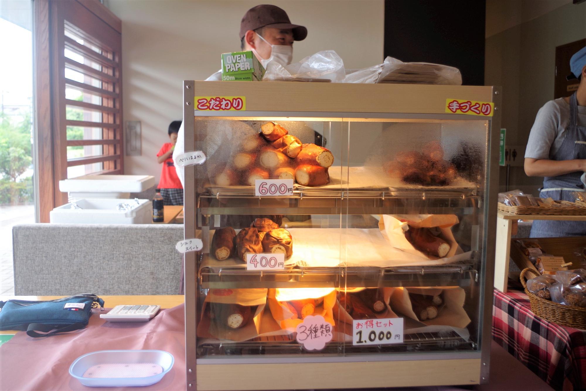 この日ショーケースに並んでいたのは、ねっとり甘くて蜜がたっぷりのべにはるかと、さっぱりした甘さとなめらかな食感をもつシルクスイートの焼き芋でした。