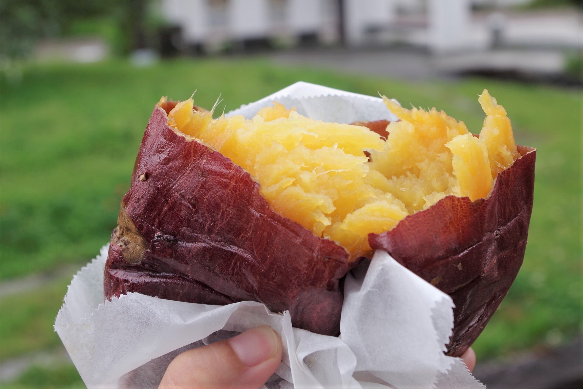 どちらを買おうか悩んだ末、人気no.1のべにはるかをチョイス。ずっしりと重たい焼き芋を割ってみると、蜜に漬け込んだようにしっとりとした黄金色に仕上がっています。 焼き芋好きさんならこの写真を見ただけで美味しいのがおわかりいただけるかと思います! お芋を焼いただけでこんな風になるとは、すごいですね。