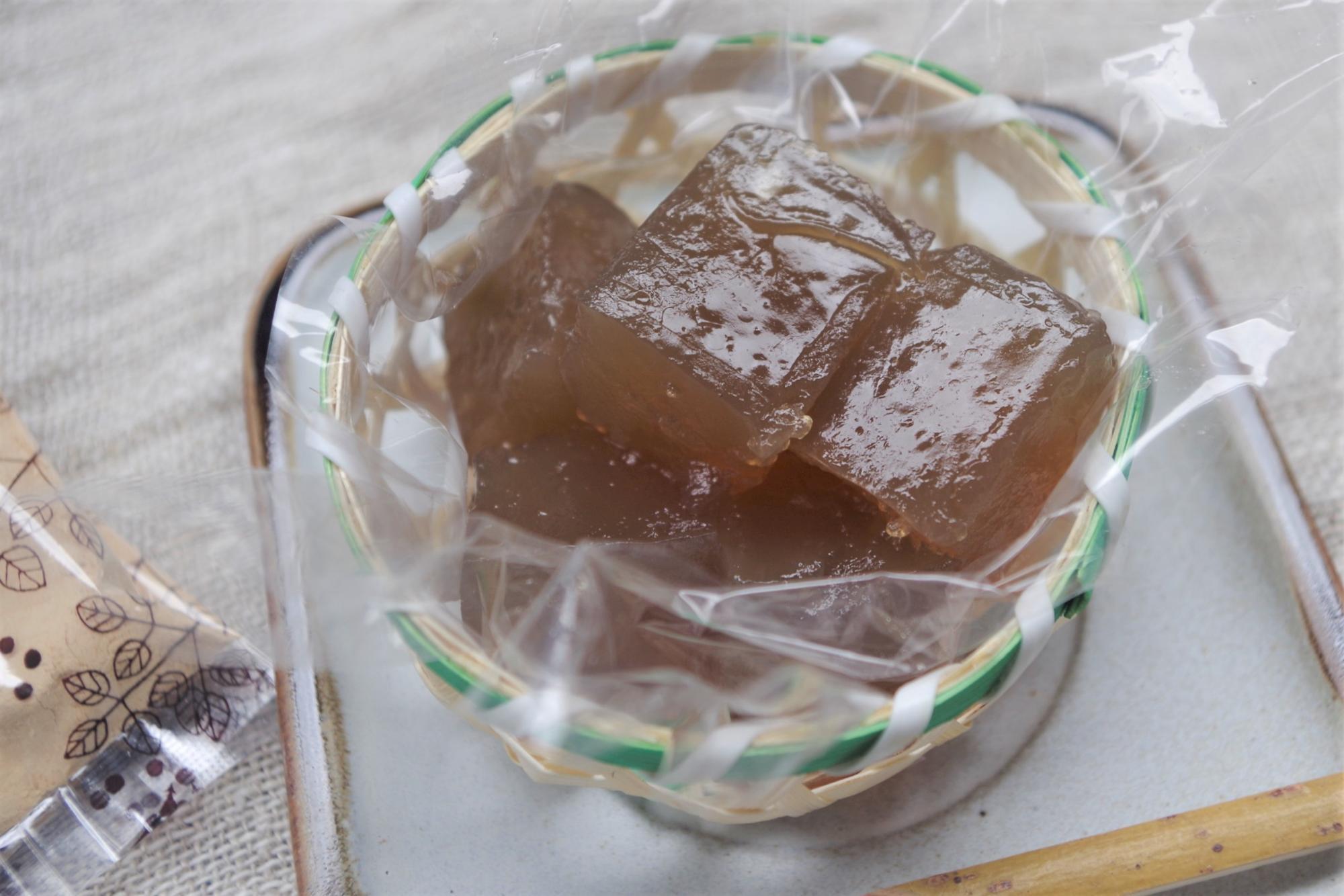 味の余韻にも上質さが感じられる素敵なおやつでした。 続いては、増田和菓子店のプルンプルンの喜界島の黒糖を使用した蜜入くずもちをいただきます。くずもちに使われているくず粉は、奈良県吉野地方でつくられる吉野葛を100%使用。とっても希少なくずもちなんだそうです。