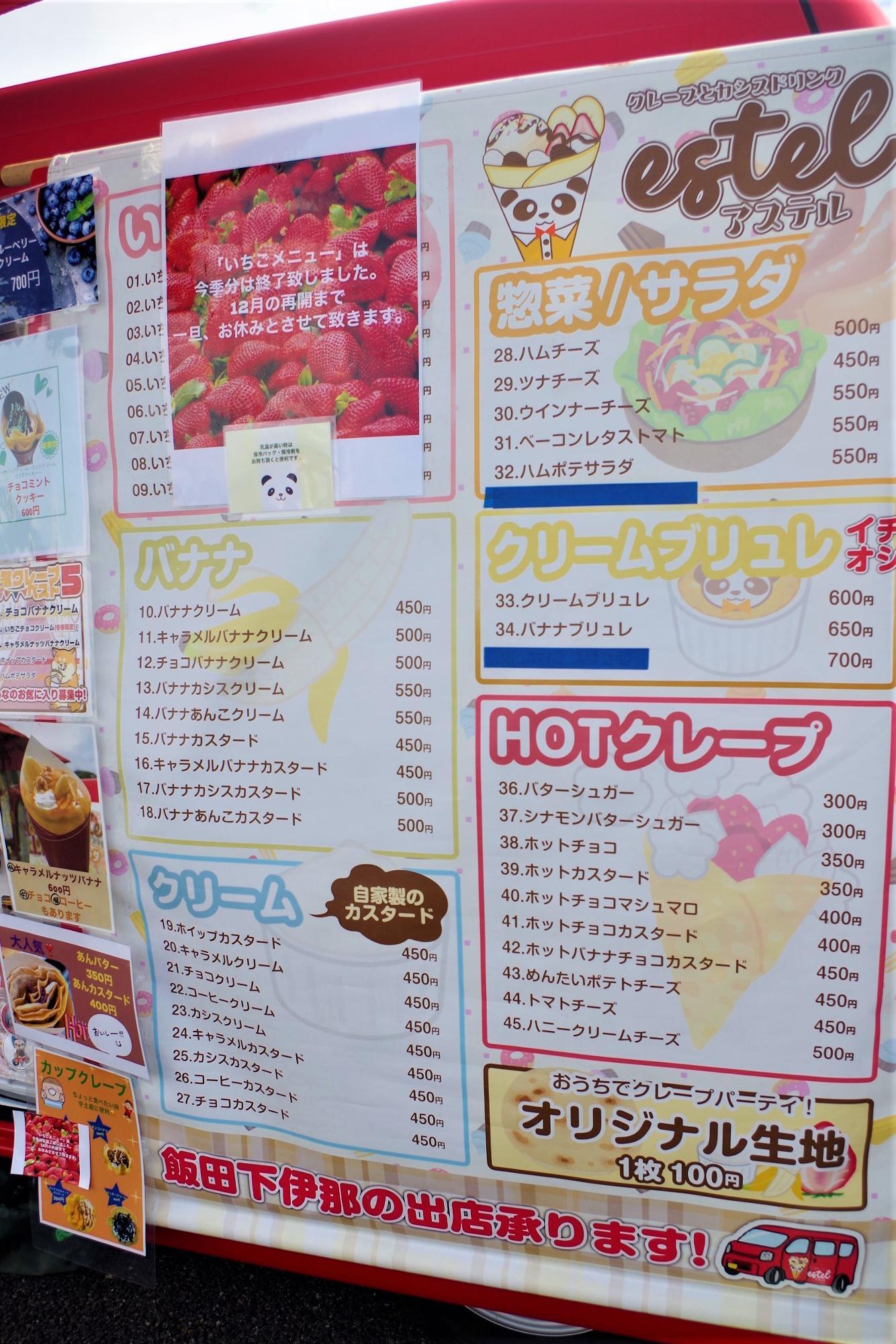まずはクレープメニューをチェックしてみます。冬春限定の苺にちなんだメニューは、6月現在はお休み中なのですが、それでもざっと数えてバナナ系、クリーム系、惣菜系など40種類以上のクレープメニューがあります。