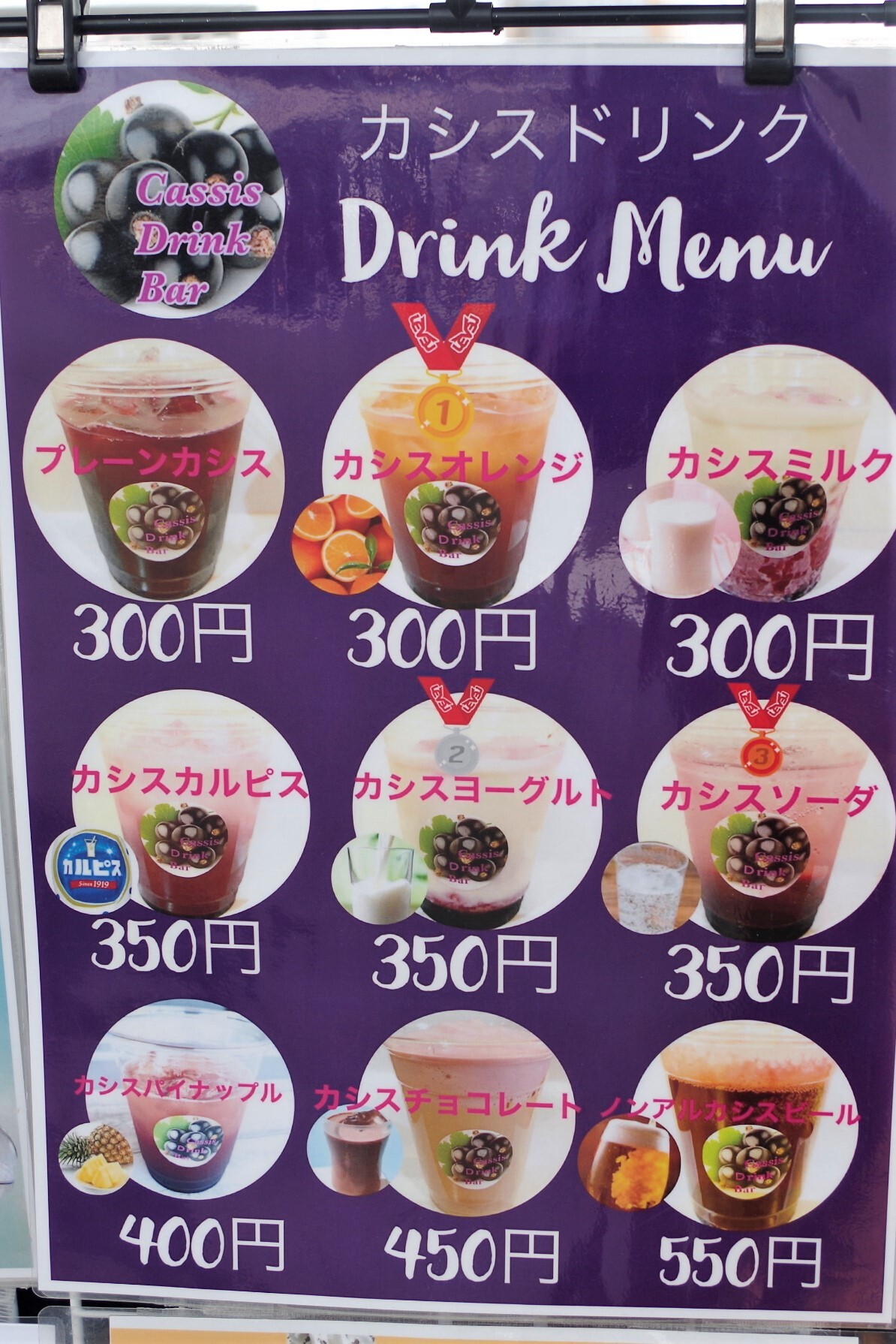 元々キッチンカー・アステルはカシスドリンク専門だったそうで、今でもカシスドリンクの品ぞろえが充実。なんと9種類ものカシスドリンクがあります。まるでカクテルみたいな組み合わせのものもありますね。