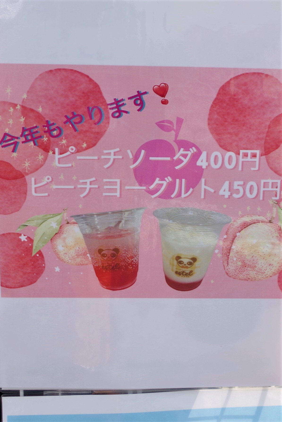 お次のドリンクは、ピンクベースのメニュー表がかわいいピーチソーダ&ピーチヨーグルト。今年もやります! ということは、昨年も展開されていた人気メニューということですね。