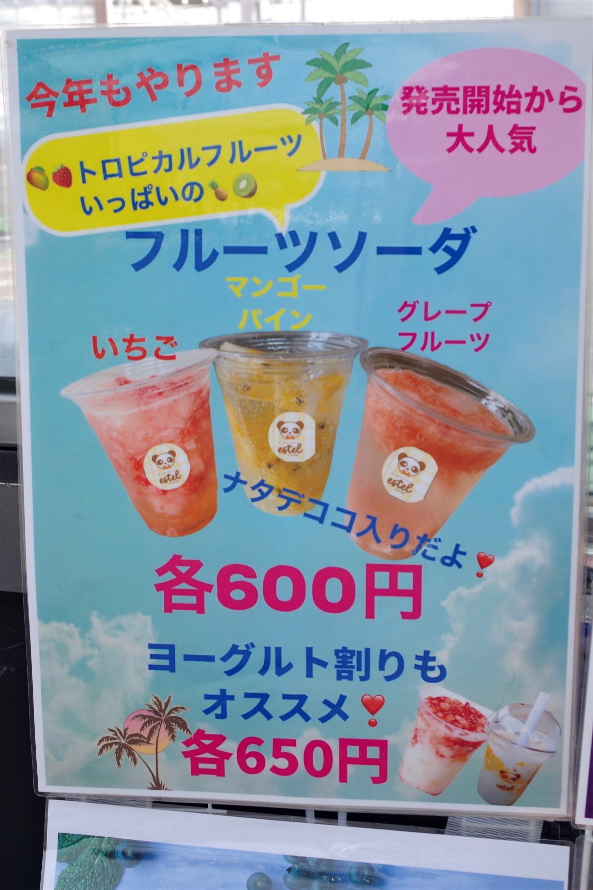トロピカルフルーツの果肉やナタデココが入っているフルーツソーダも! 映えますね。