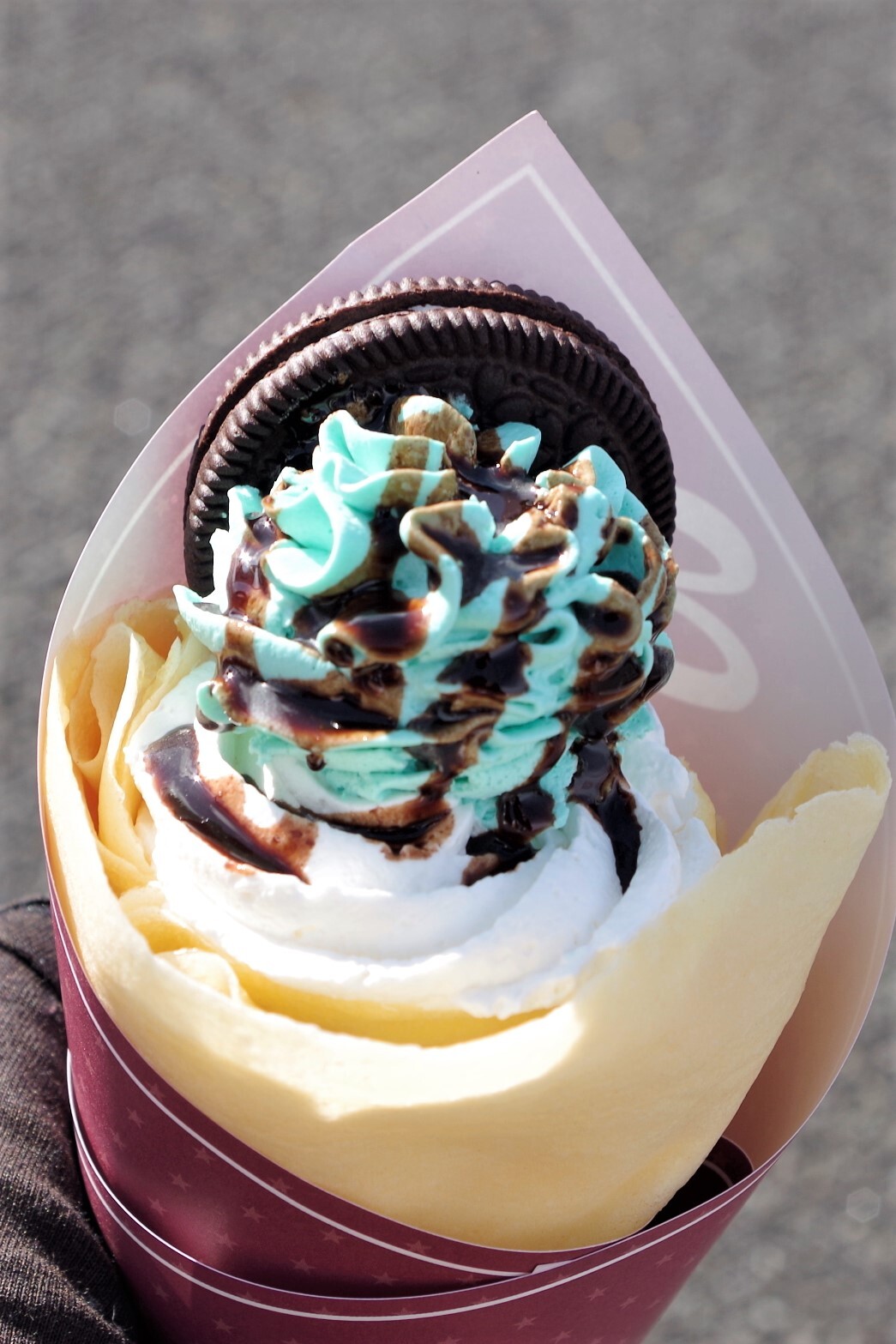 お次はチョコミントクッキークレープ。クレープ生地からはみ出すほどモリモリ盛られたチョコミントクリームに、ココアクッキーが丸ごと1個乗っかったボリュームありの一品です。