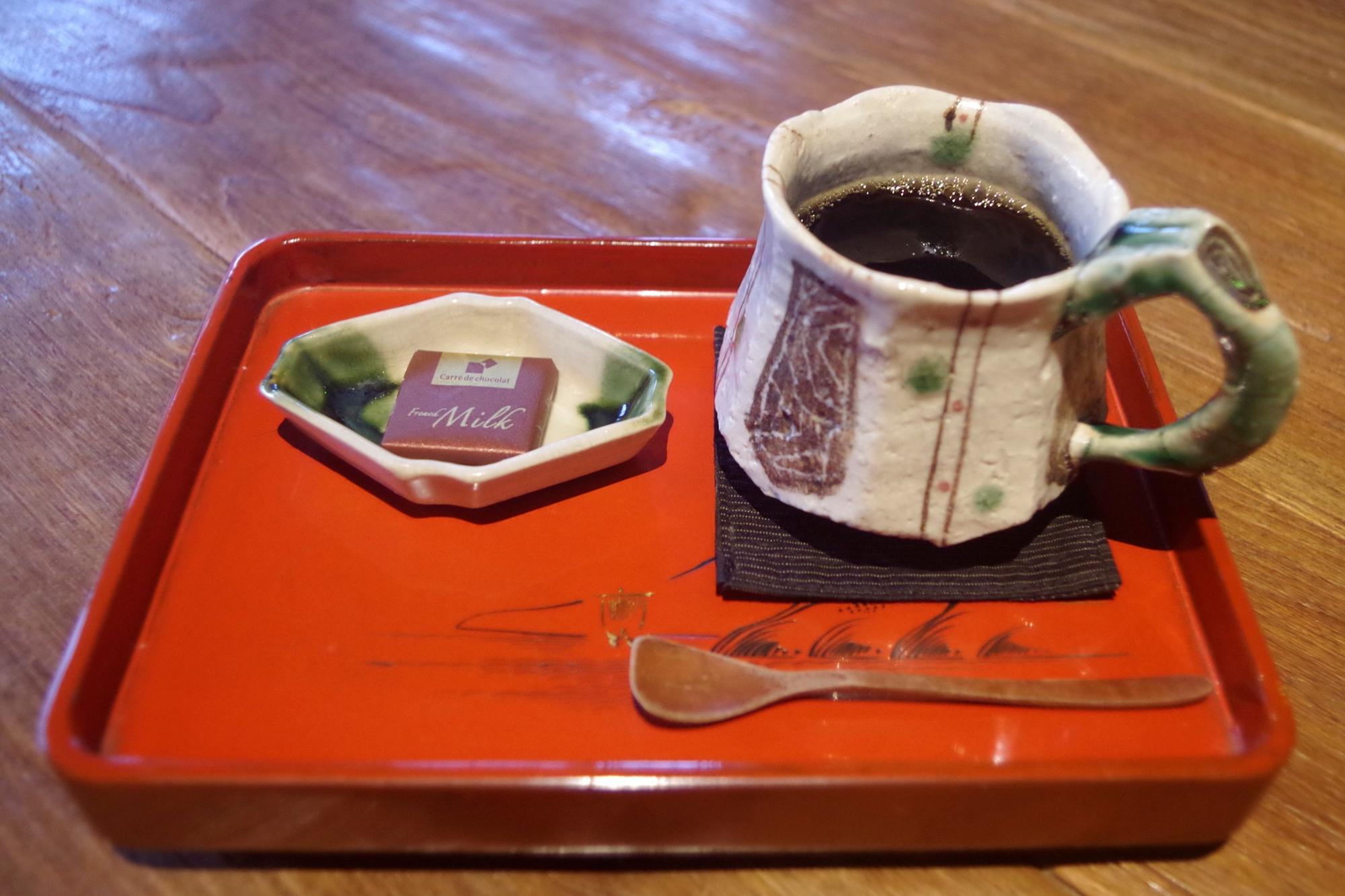 岐阜県土岐市の陶芸作家さんによるオリジナルの器でいただく珈琲「風ブレンド(税込550円)」は、苦みと酸味のバランスがよいブレンドコーヒー。深みのある味わいに、添えられたミルクチョコレートが相性抜群です。