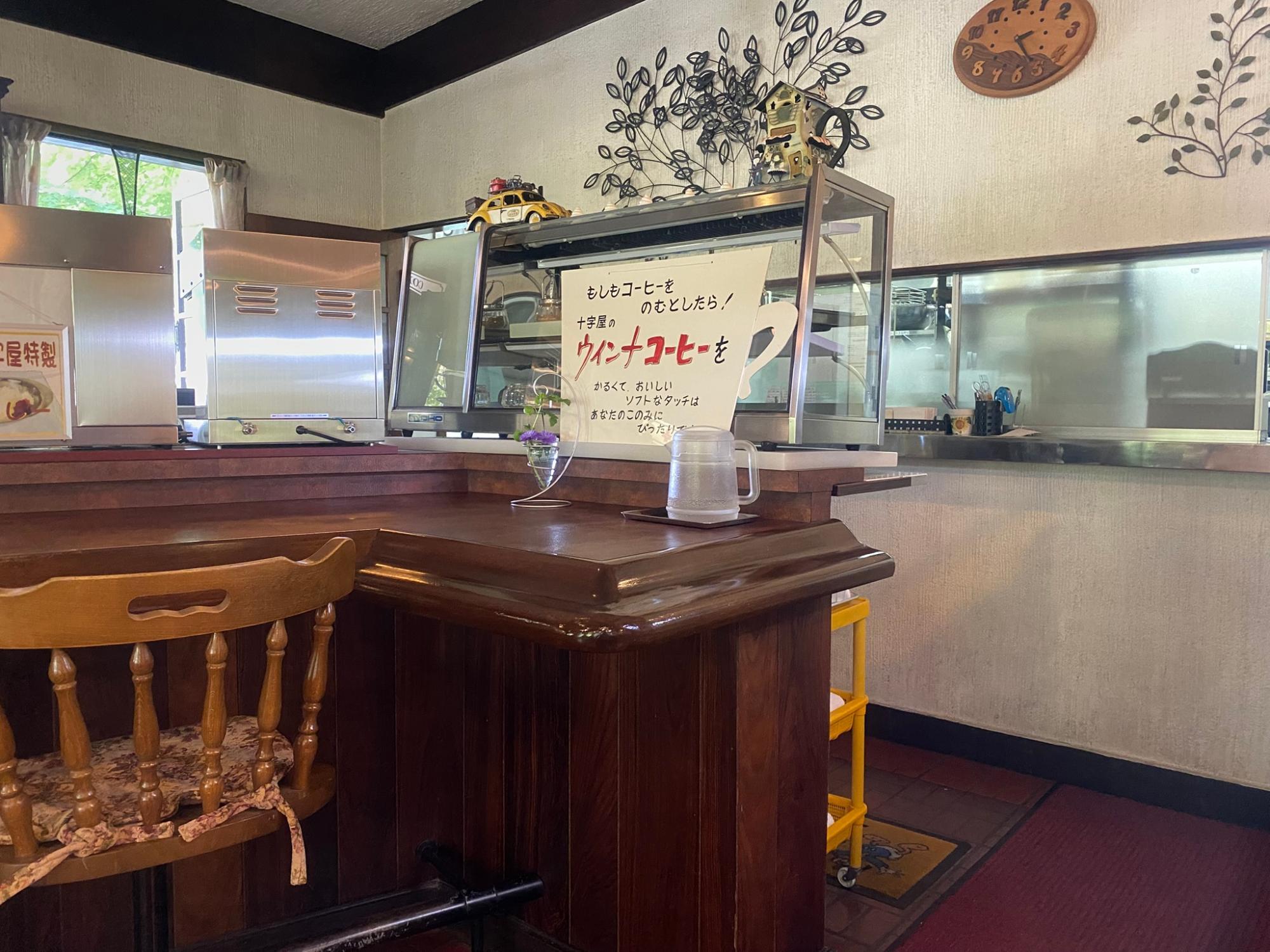 店内にはテーブル席のほかにカウンター席もあり、カウンターの端にはウィンナー珈琲を勧める小さな看板が掲げられています。昭和らしい書体で書かれたその看板は、どこか懐かしい雰囲気。お店の空気と静かに溶け合っています。