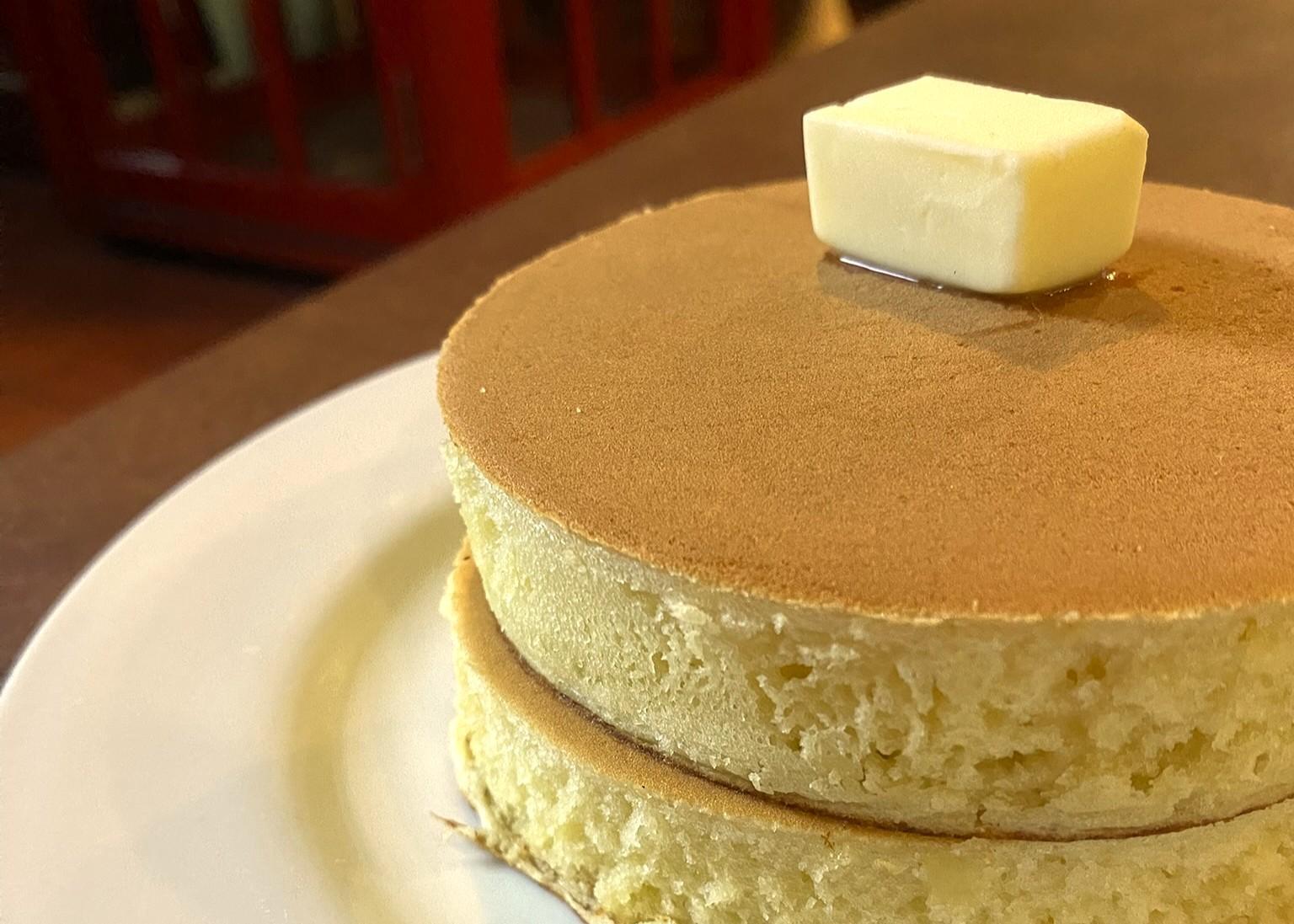 この店を訪れる多くの人が注文するのは、厚みのあるホットケーキ(税込1,000円)。どこからナイフを入れようか迷うほど、つるっときれいな焼き色。バターとシロップをたっぷりかけていただきます。