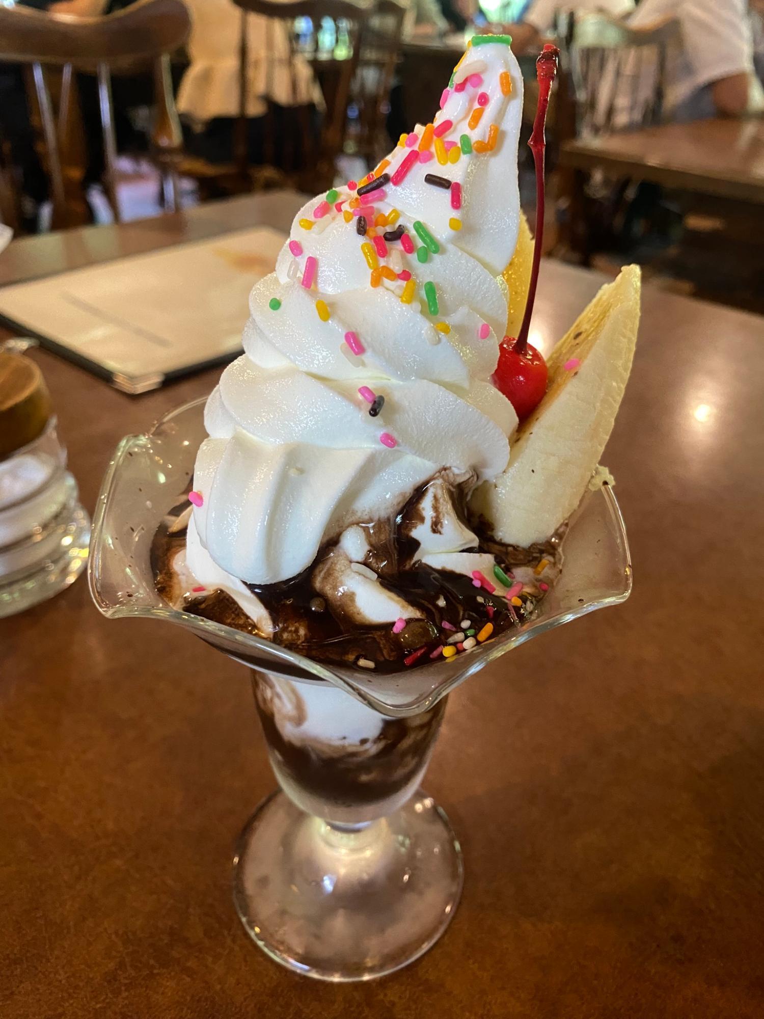 ソフトクリームがぎっしり詰まり、大ぶりのバナナが存在感を放っています。