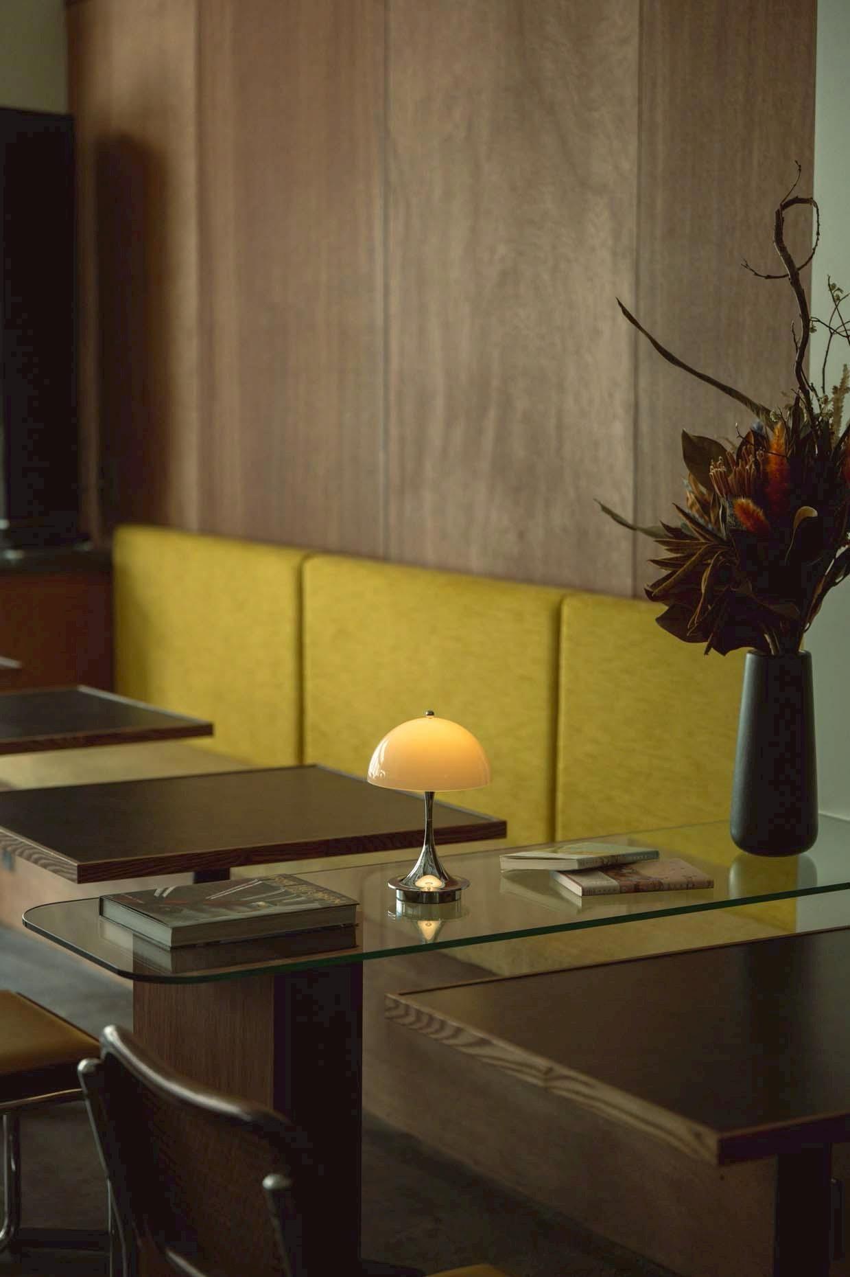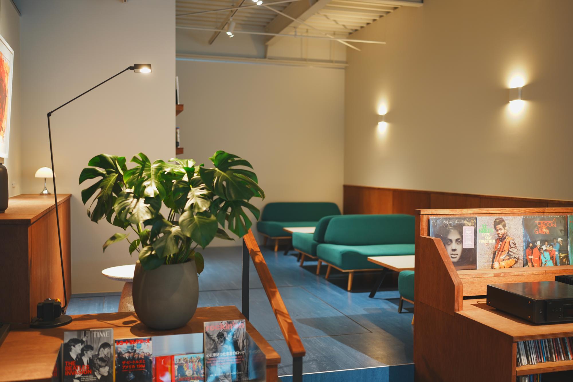 店内はカウンター席、ソファ席、テーブル席に分かれていて、それぞれの椅子やソファ、テーブルが違っているのに全体が不思議と調和しています。ミッドセンチュリーの家具やアート、グリーン、やさしい照明がバランスよく配置され、海外のリノベーションカフェを思わせるモダンな雰囲気です。