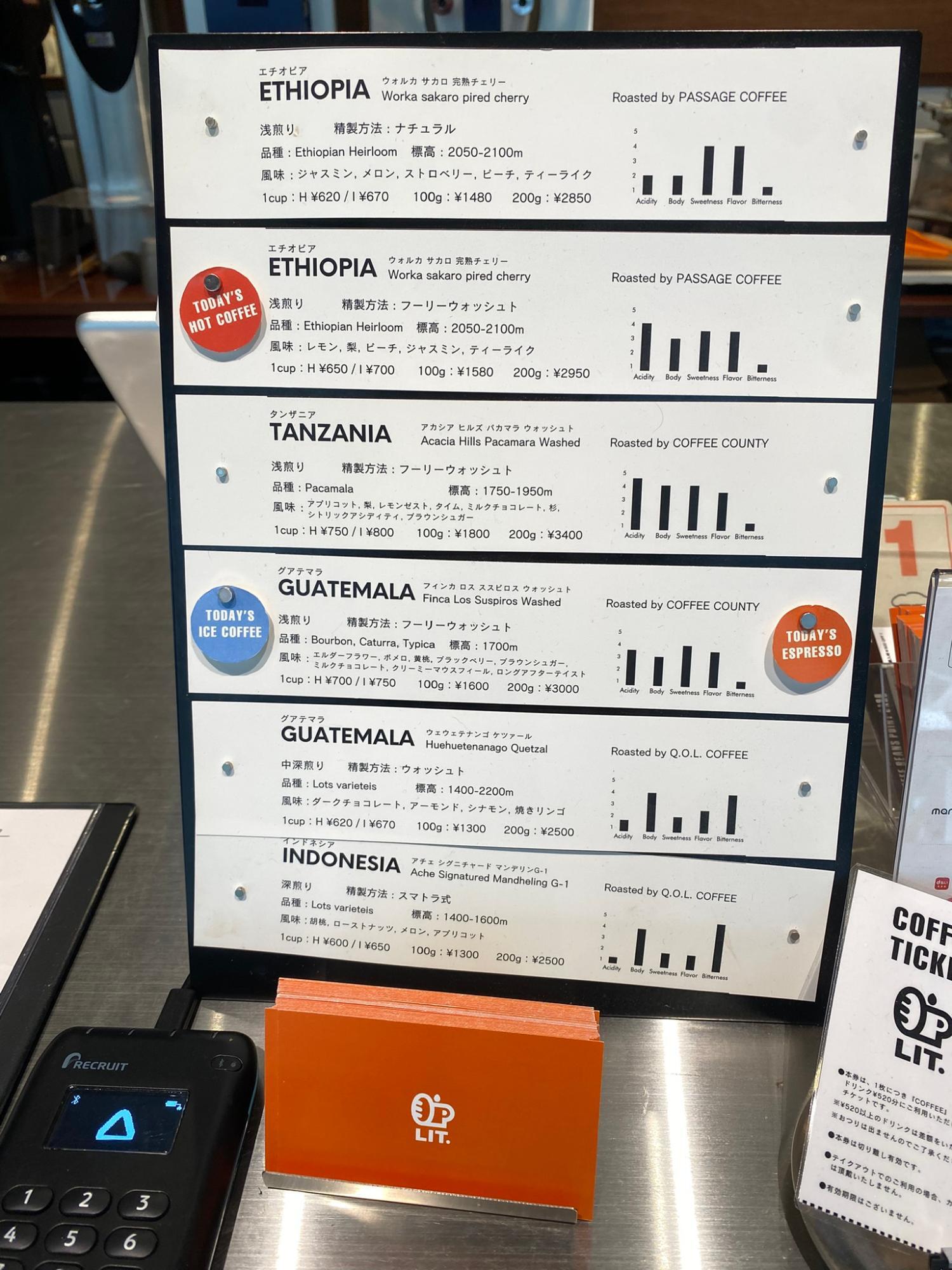 そもそも店主がコーヒーにはまったきっかけは、品質の高いシングルオリジンに出会ったこと。こうした経験を活かして、LIT.ではコーヒー豆の個性を感じやすい、浅煎りで甘みのあるものが多めにラインナップされています。