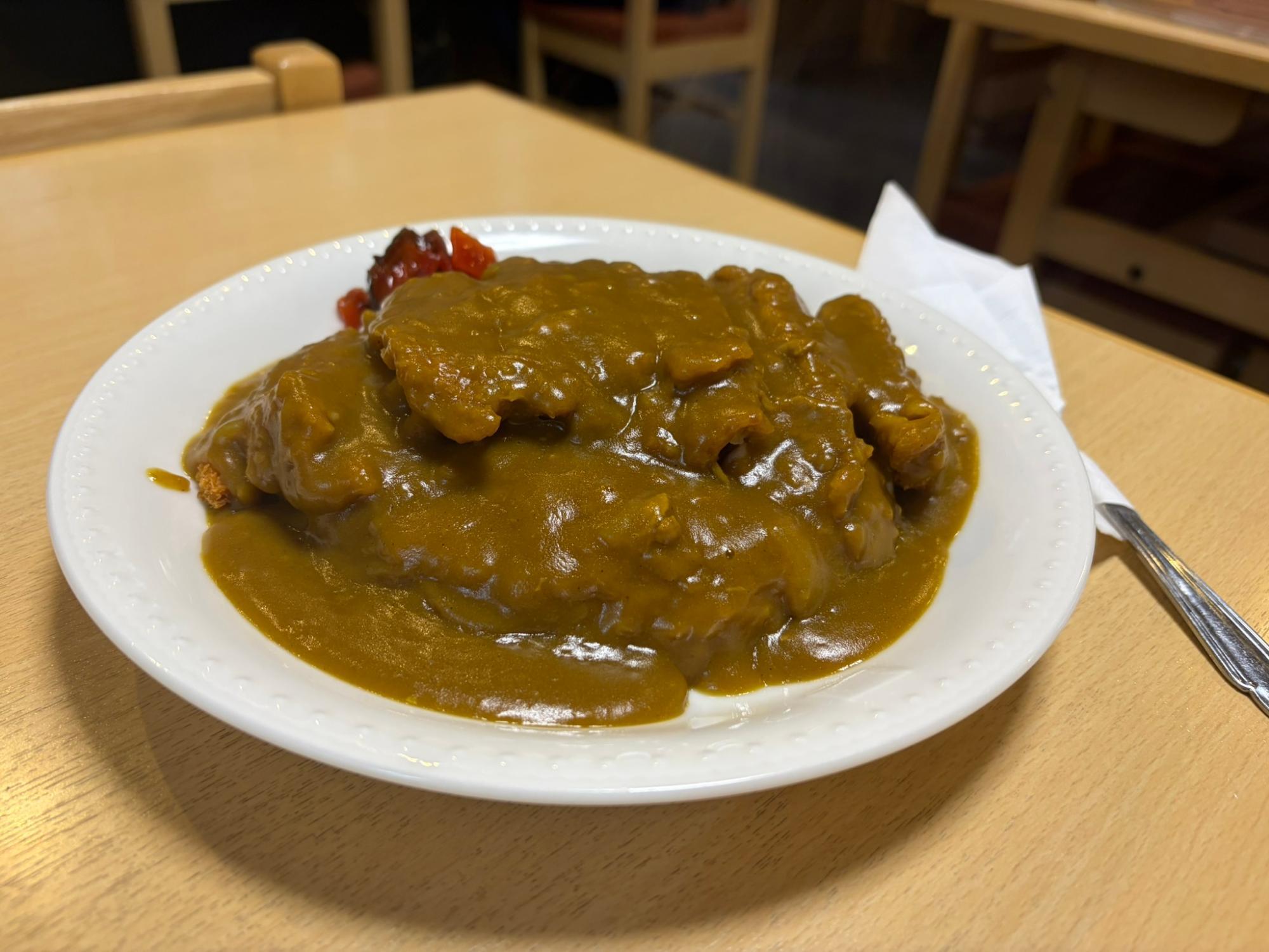 人気メニューはカツカレー、チキンカレー、かつ丼、煮カツ、そして五平餅など。どこか懐かしく、食べる人の心まで満たしてくれる味です。