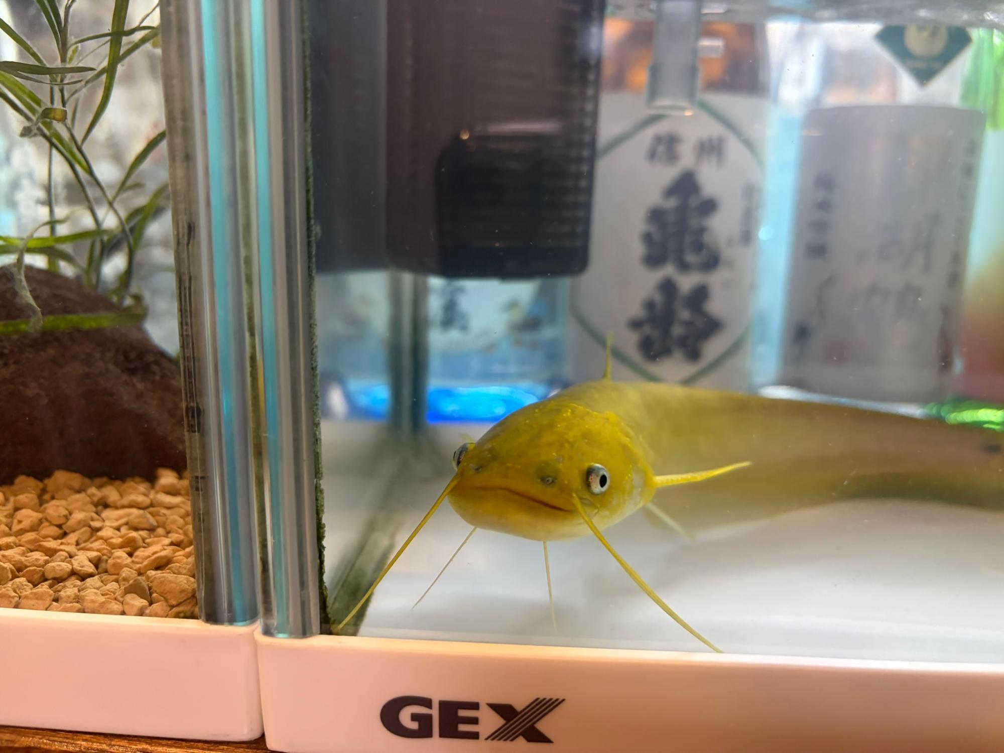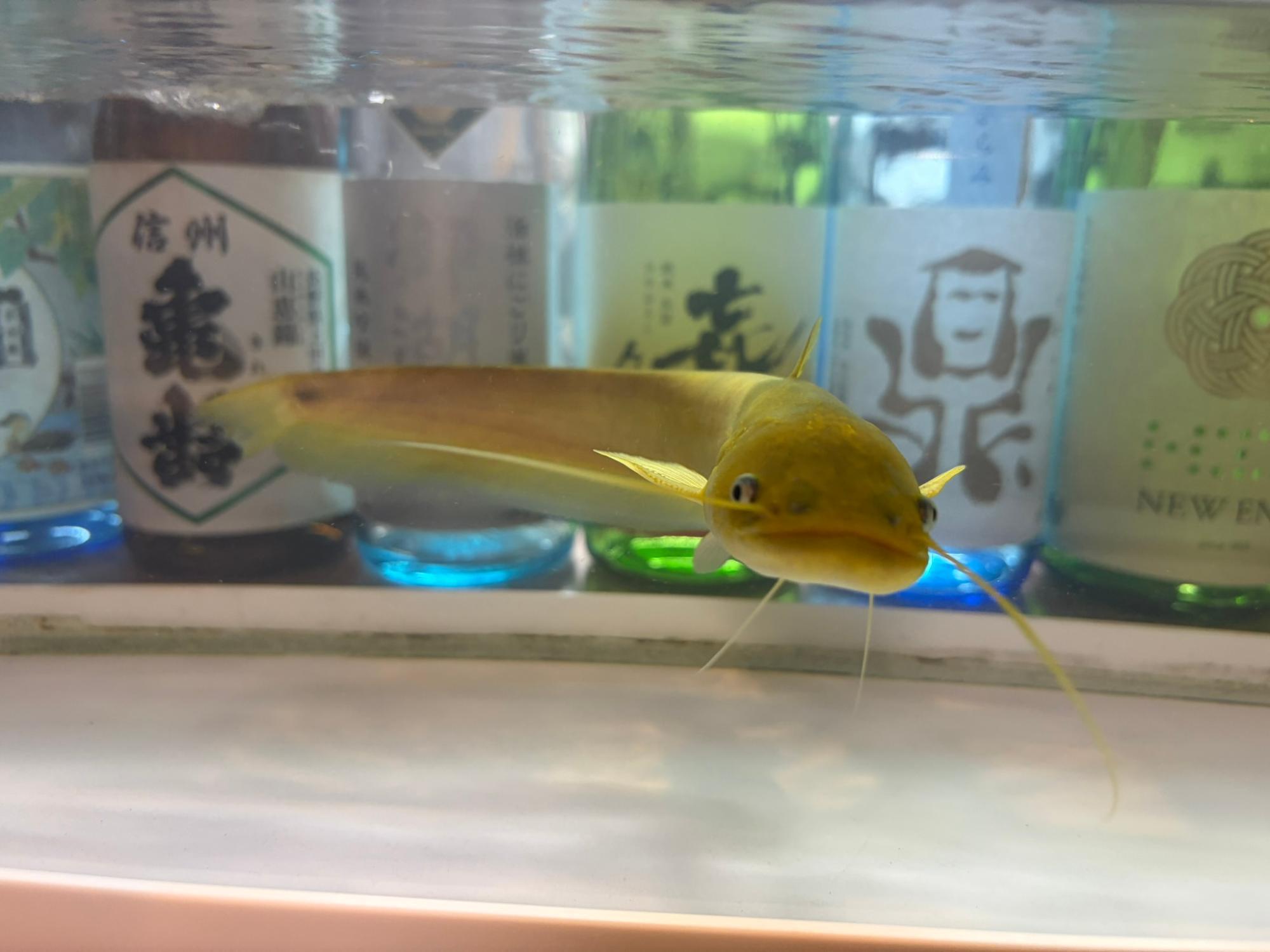 三河家のカウンターには透き通った美しい水槽が置かれています。そこにはユラユラと泳ぎ続ける魚影…。なんと金色のナマズ!
