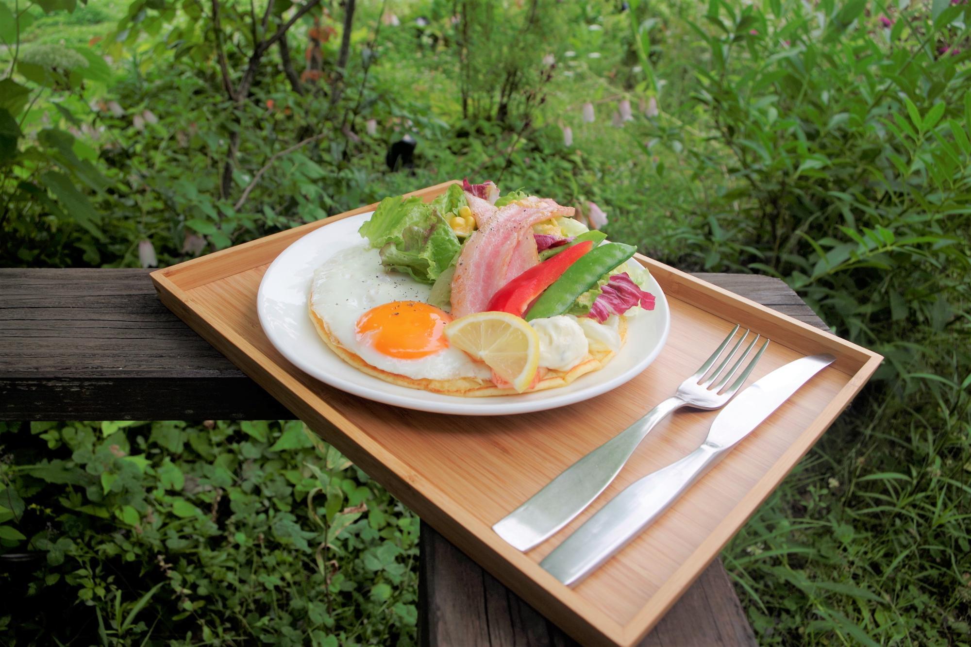 県内産小麦でつくられたパンケーキがメインの「ベーコンとたまごのサラダパンケーキ(税込1100円)」