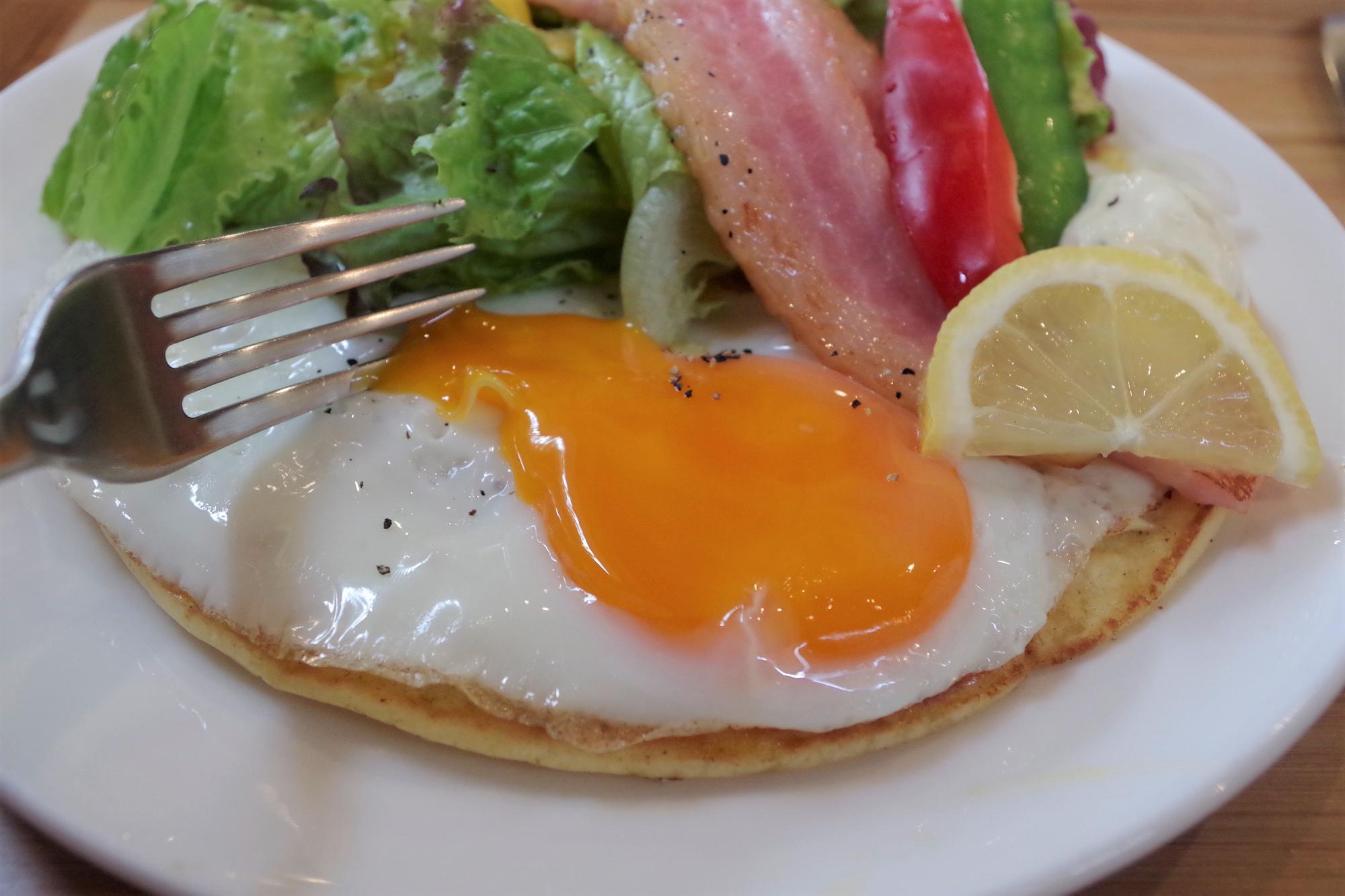 鉄製のフライパンで1枚ずつていねいに手焼きされた大きなパンケーキの上に、プルプルの黄身が魅惑的な目玉焼き、さらにその上に大きなベーコンと彩り鮮やかなサラダがたっぷり乗った、ワンプレートランチ。