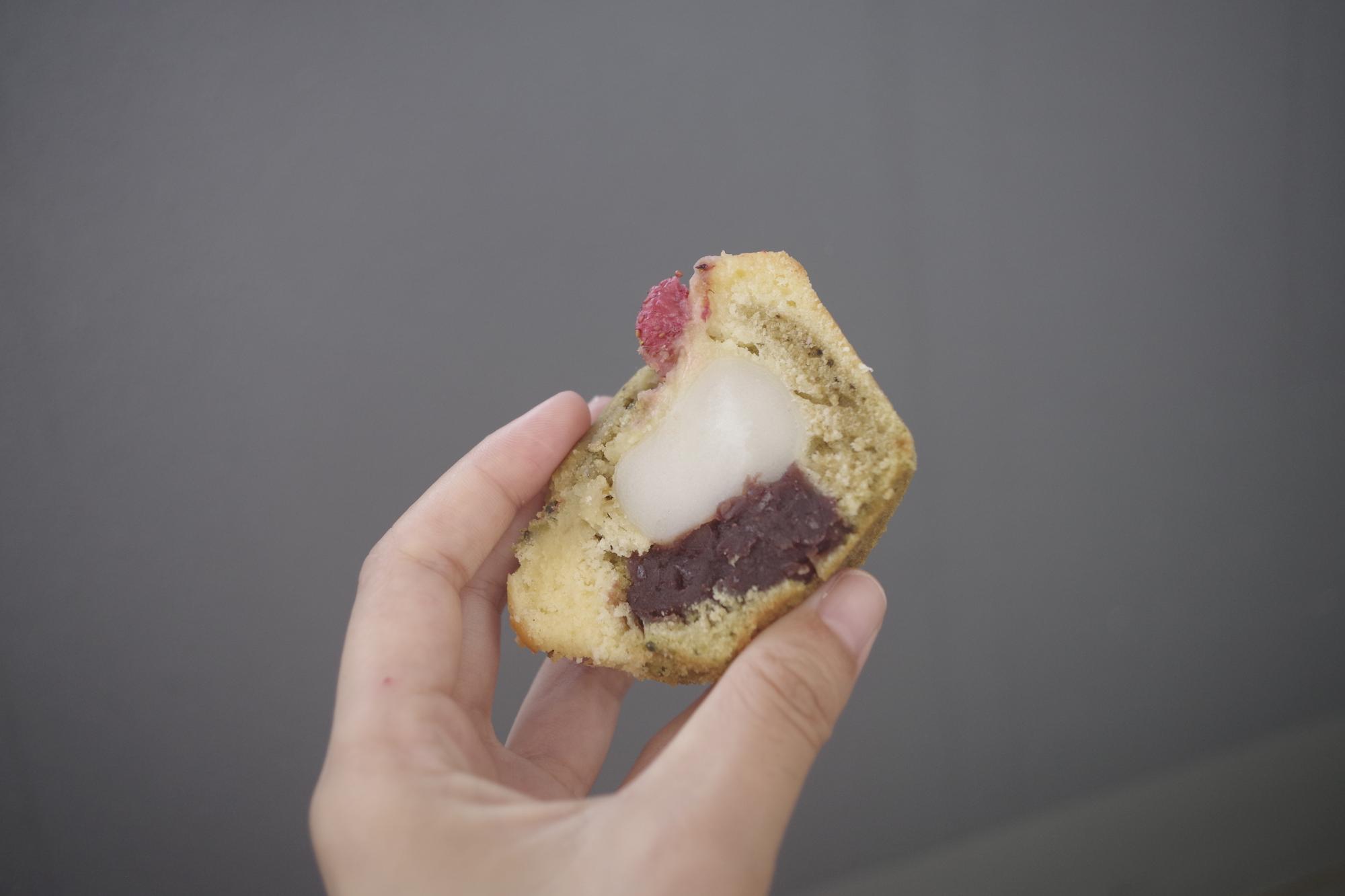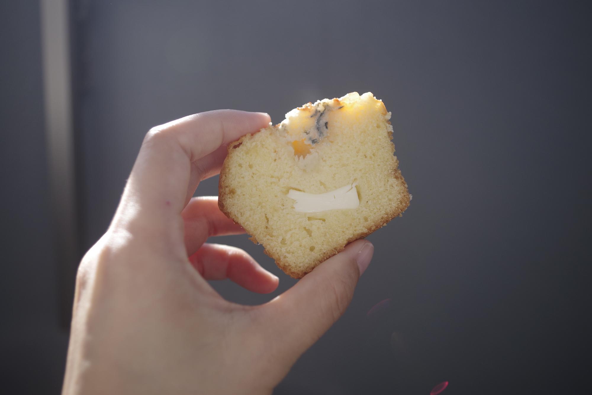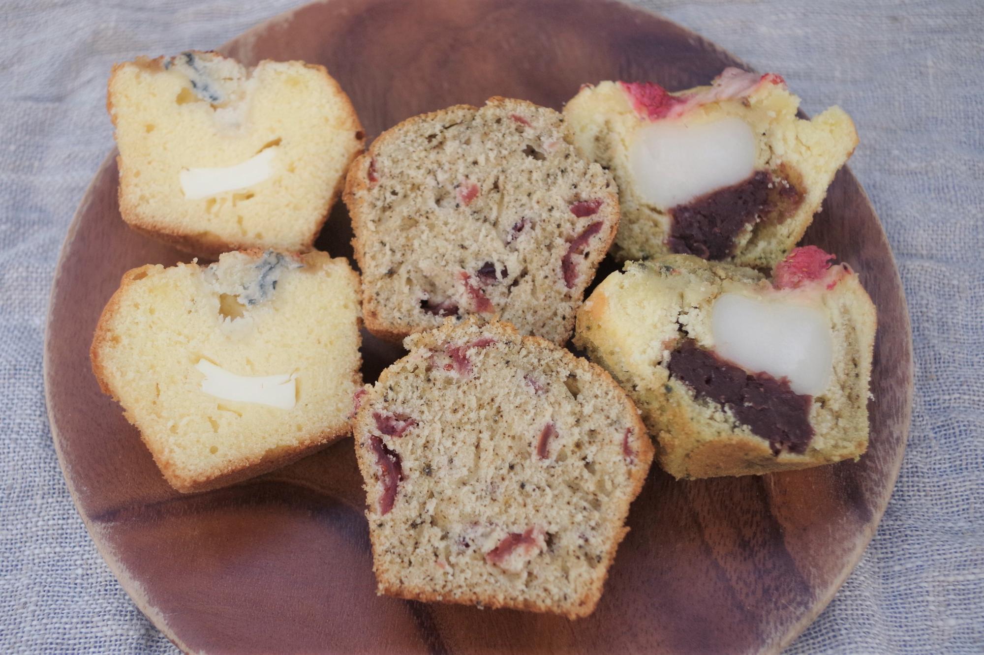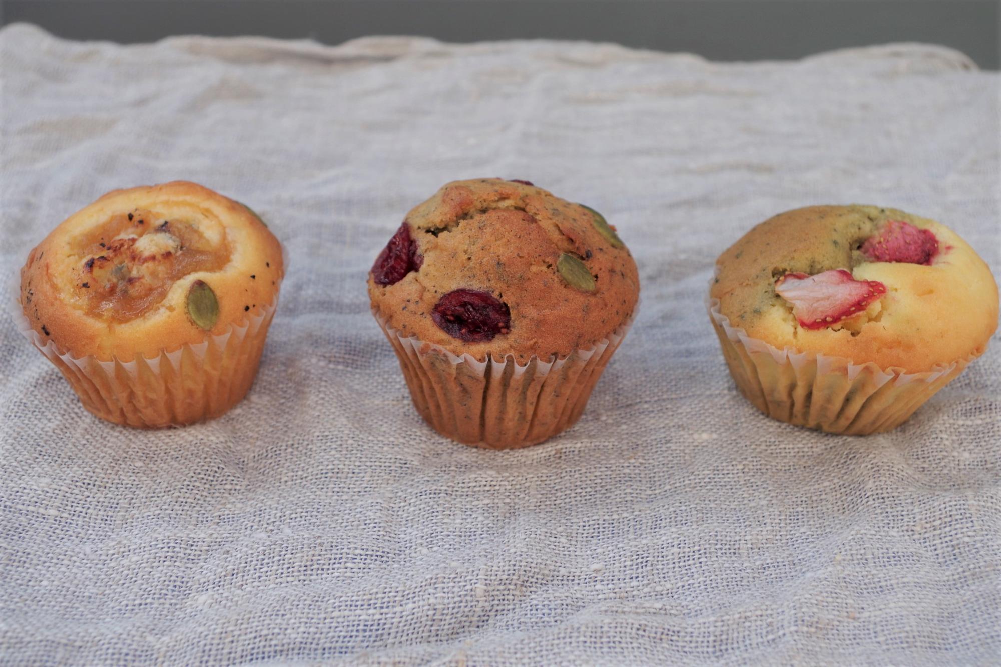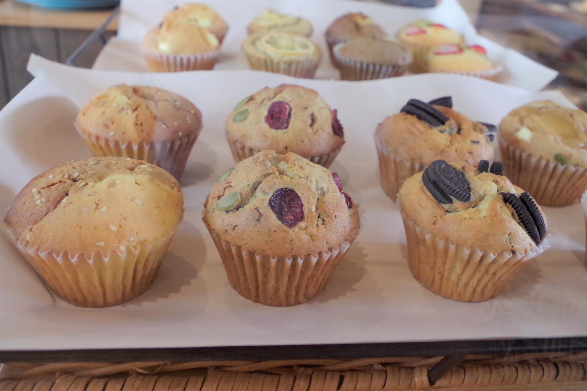 こんなマフィン、見たことありますか? 私はこんな大きな具が入っているマフィンを見るのは初めてだったので、とても感動しました。トッピングなど素材の組み合わせが面白いだけでなく、味も絶品! 甘すぎないけれど、トッピングや具によって変わる味わいが楽しくて、どんどん食べたくなってしまう美味しさでしたよ。