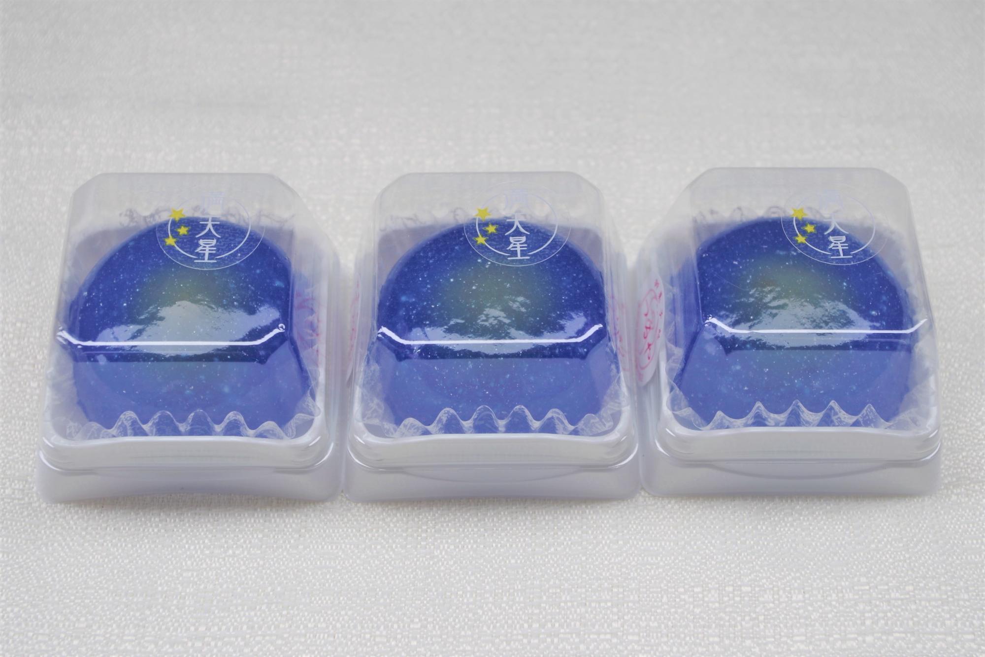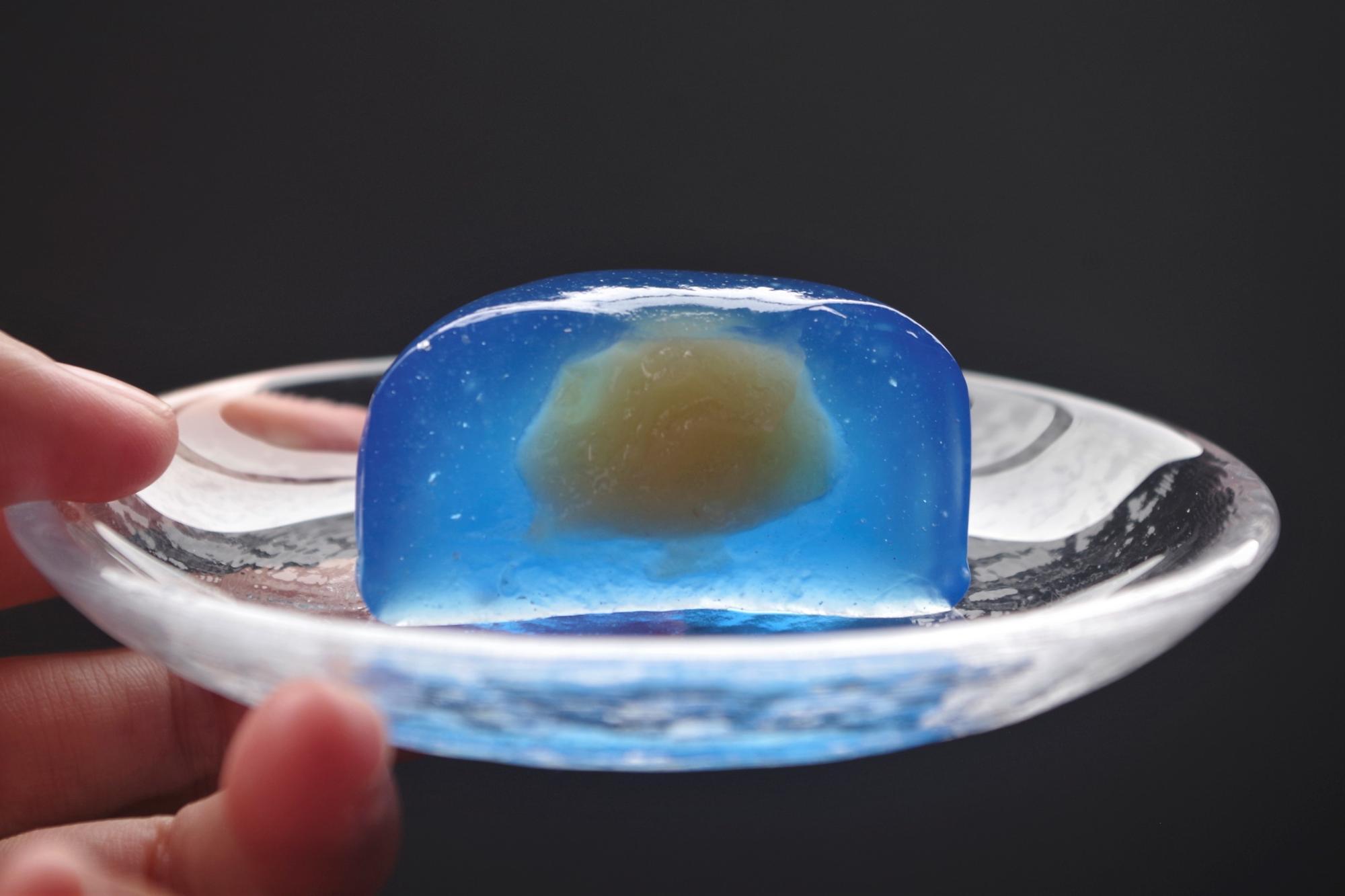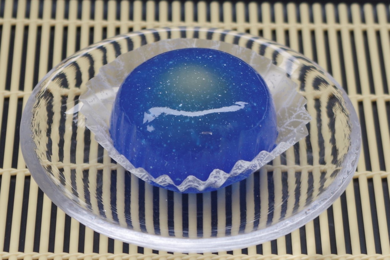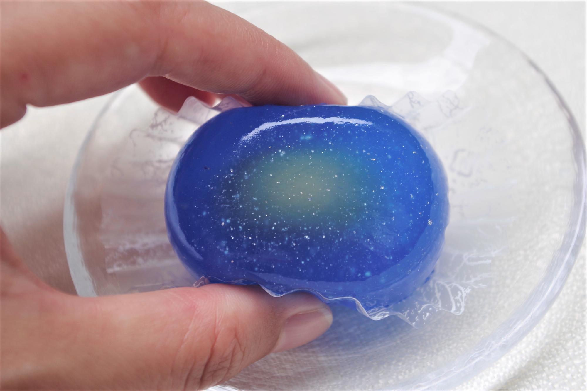深く青い銀河のような水まんじゅうの生地に、白あんが浮遊しています。切ったときに立ち上った爽やかなりんごの香りも印象的。