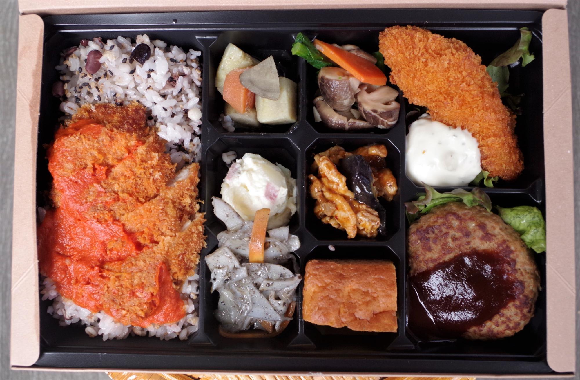 濃厚トマトソース、ピリ辛、甘酢、ハーブのきいたさっぱり味、などなど…ひとつのお弁当とは思えないほど多彩な味のおいしいおかずが詰まっています。