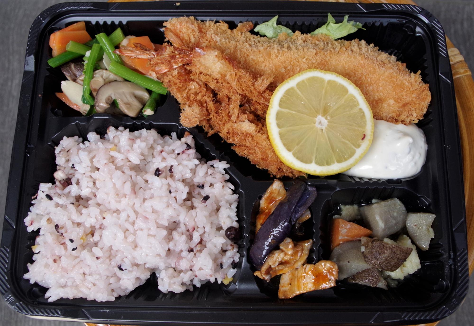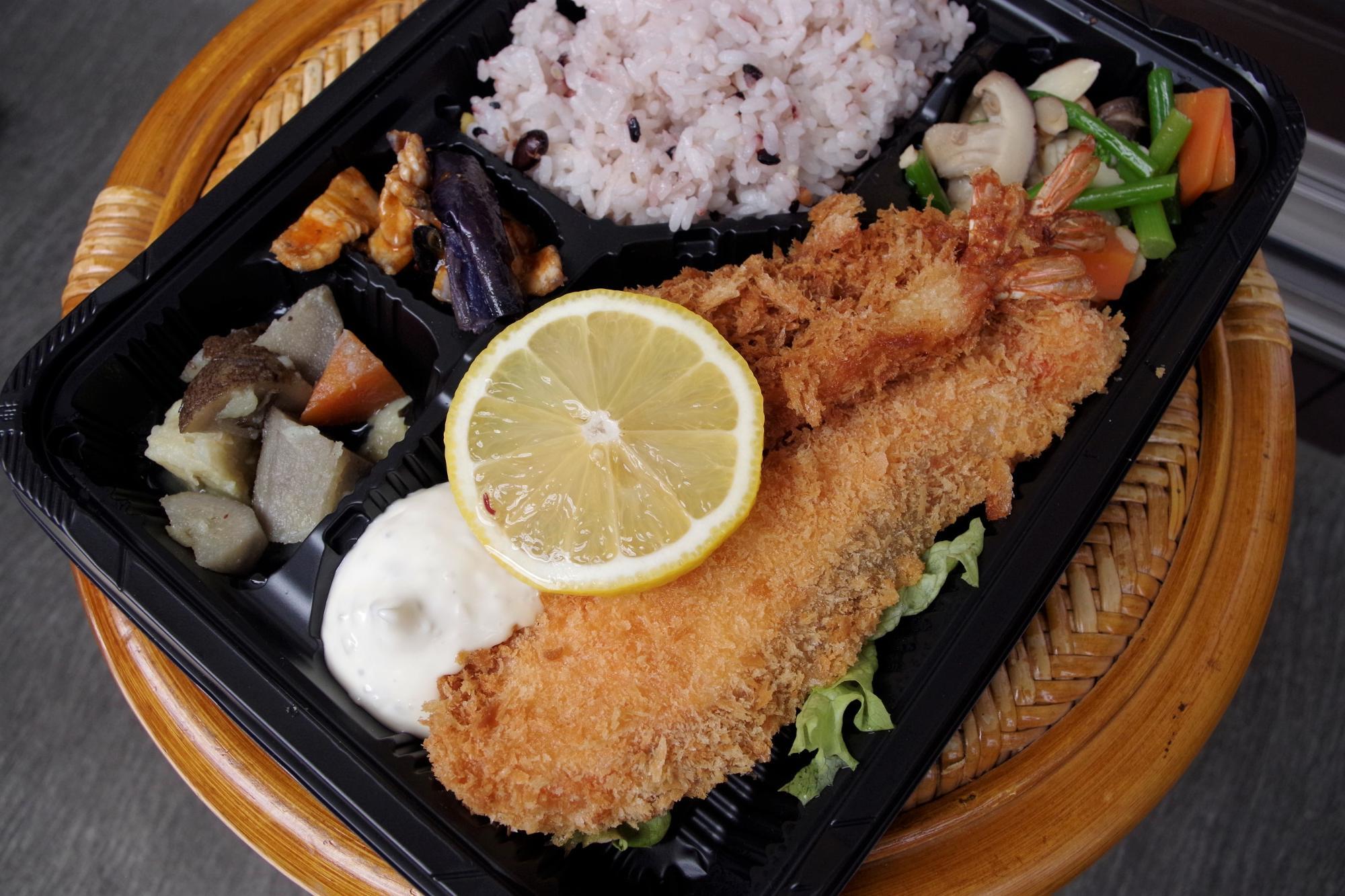 どでかいサーモンとエビのフライがドドンと入ったお弁当。冷めてしまうとパサつきがちなフライですが、サクサク感が残っているうえ、しっとりふっくらしていて美味しかったです。濃厚なタルタルソースたっぷりで美味。