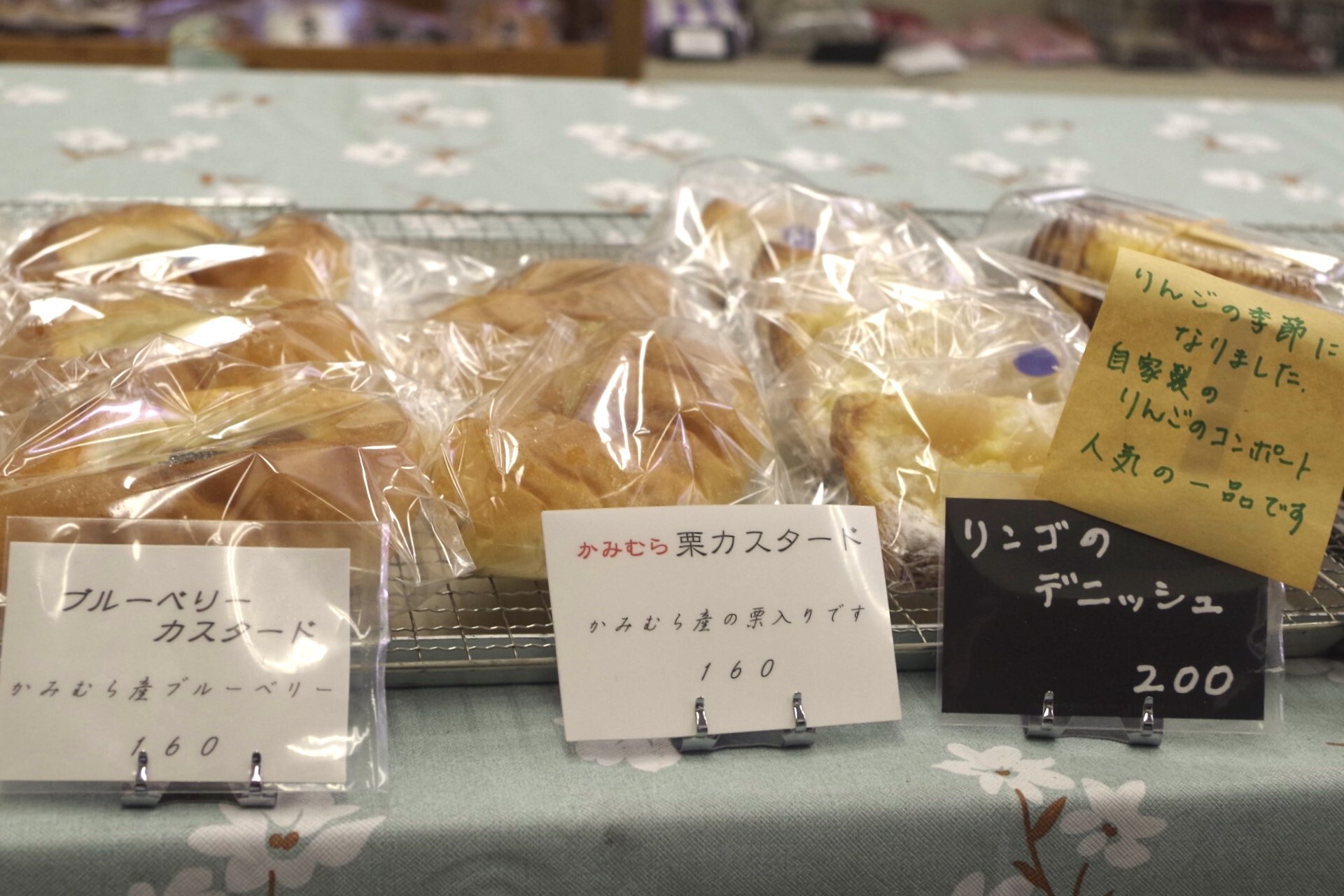 下の写真の栗カスタードは、地元産の栗を拾ったものでクリーム作りをしているんだそうですよ! まさにご当地パンですね。そのほか、かみむら産ブルーベリーを使用したパンや、 自家製りんごのコンポ―トを使ったデニッシュなどもありました。
