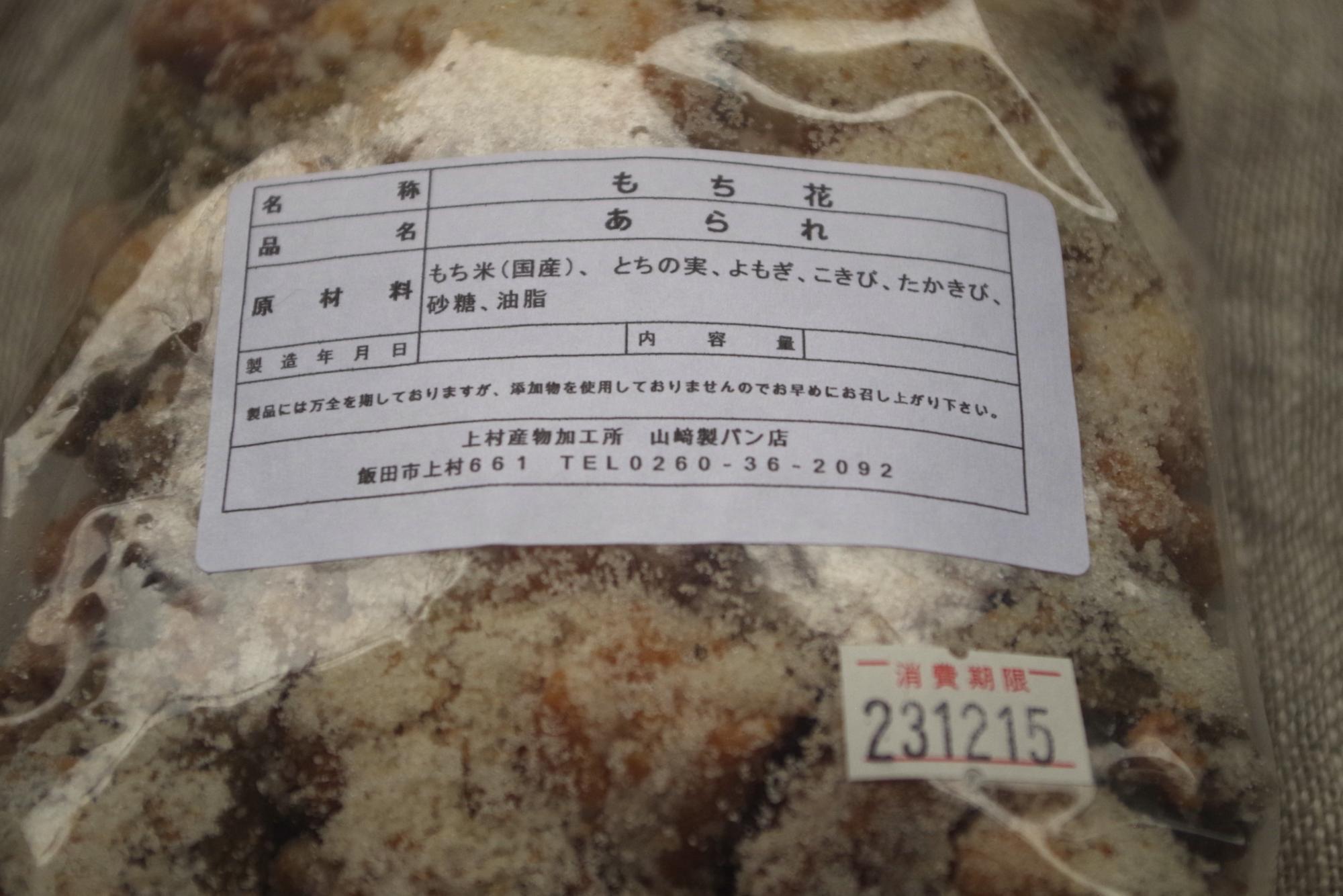 パン以外にも、販売されているものがあったので手に取ってみると…あられも自家製でした! 冬場にはこのパン店でお餅つきもするそうで、そのお餅からつくる「餅花」というあられなのだそうです。これは、初代店主の手作り。