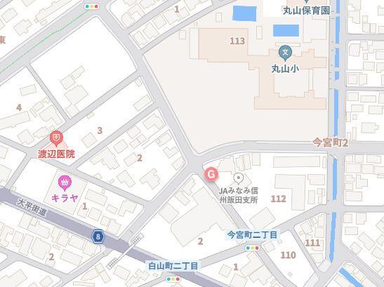 下記の地図上に(G)のマークを入れてみました。丸山小学校と、JAみなみ信州飯田支店の間にある場所です。