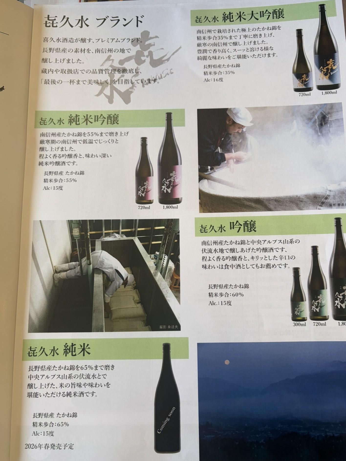 南信州の水と米、そして長年培ってきた酒造りの技を土台に、風土と食文化を未来につなぐ酒を目指す。それが「㐂久水」ブランドの核にあります。