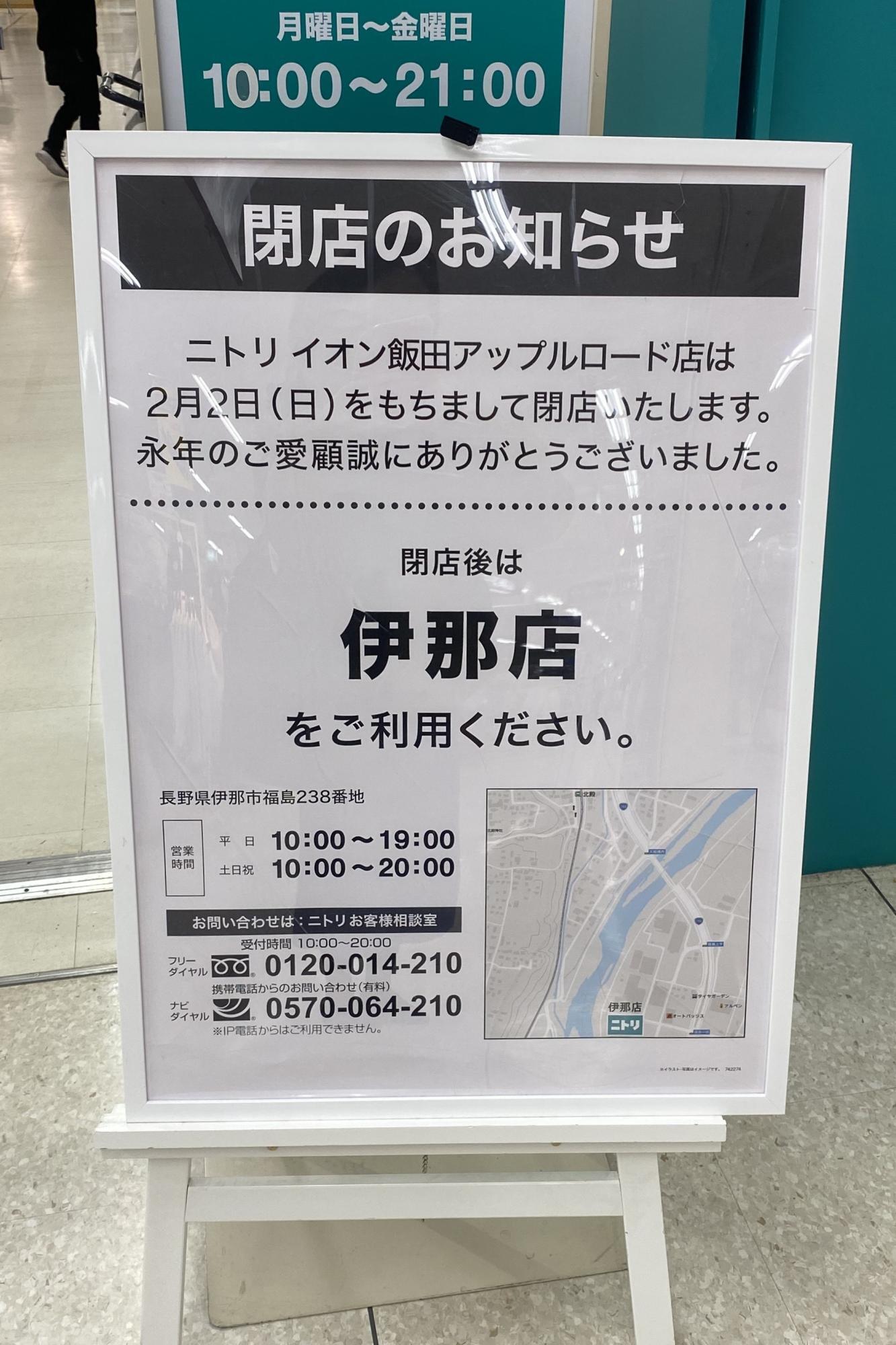 昨年末、張り紙にて驚きのニュースを知りました。2025年2月2日(日)をもって、イオン飯田アップルロード店2階にあったニトリが閉店してしまうとのこと。飯田市における最寄りのニトリは、今後はニトリ伊那店になってしまうようですね。