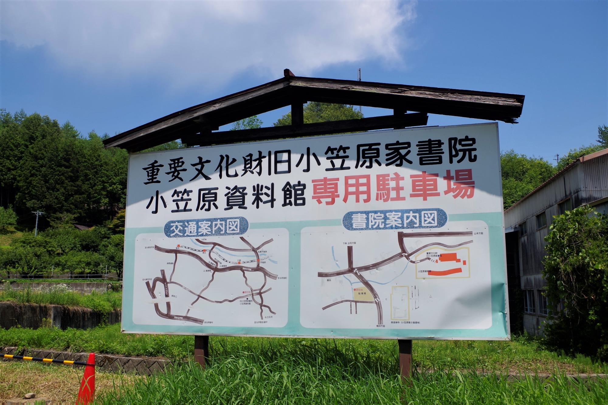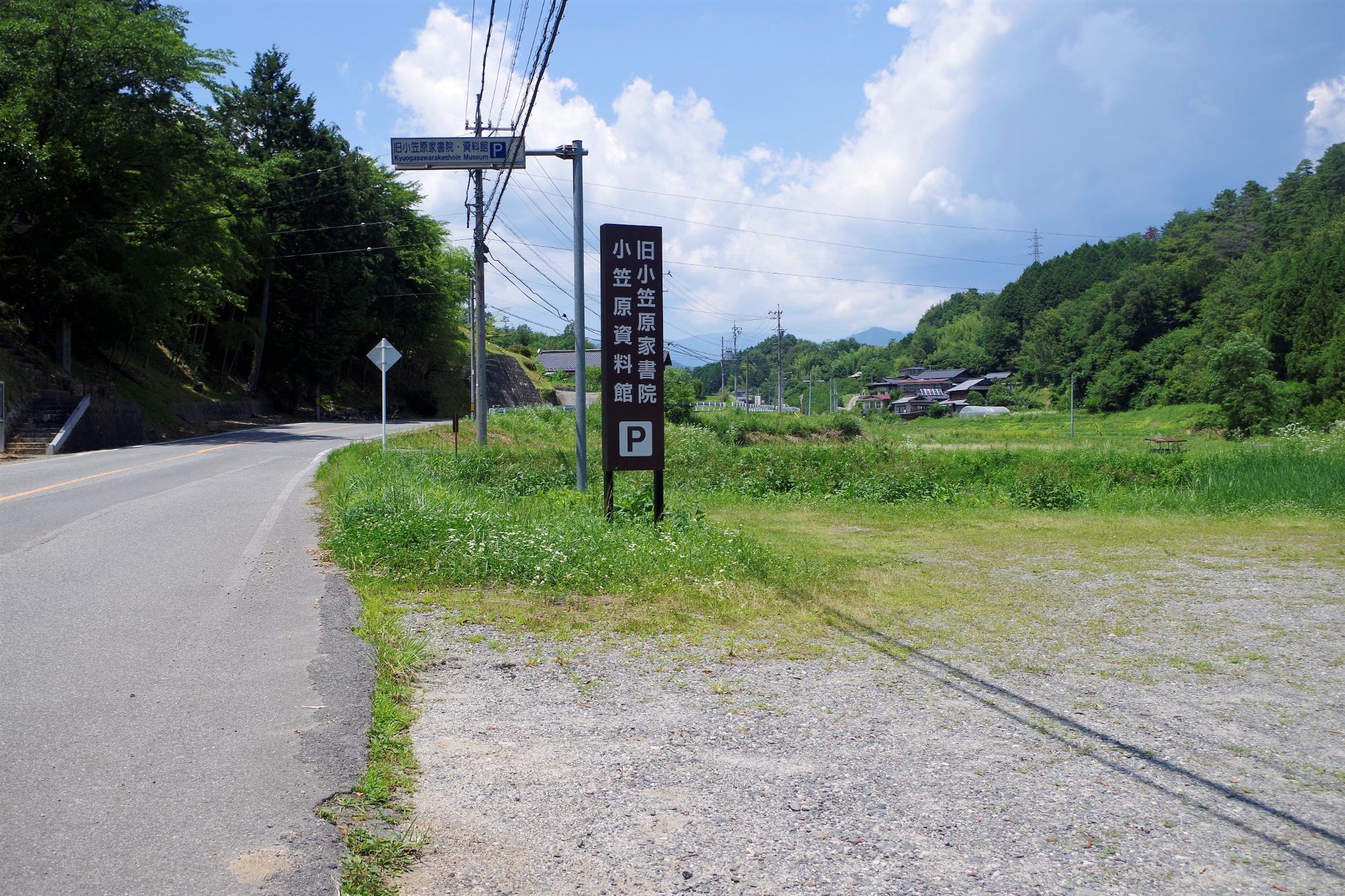 旧小笠原家書院と小笠原資料館の駐車場。飯田中村線道路沿い、興徳寺の向かい側に位置しています。