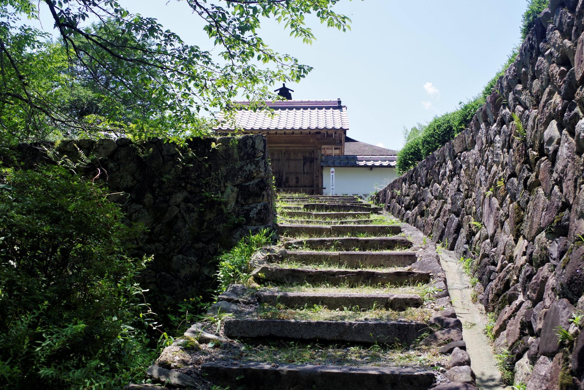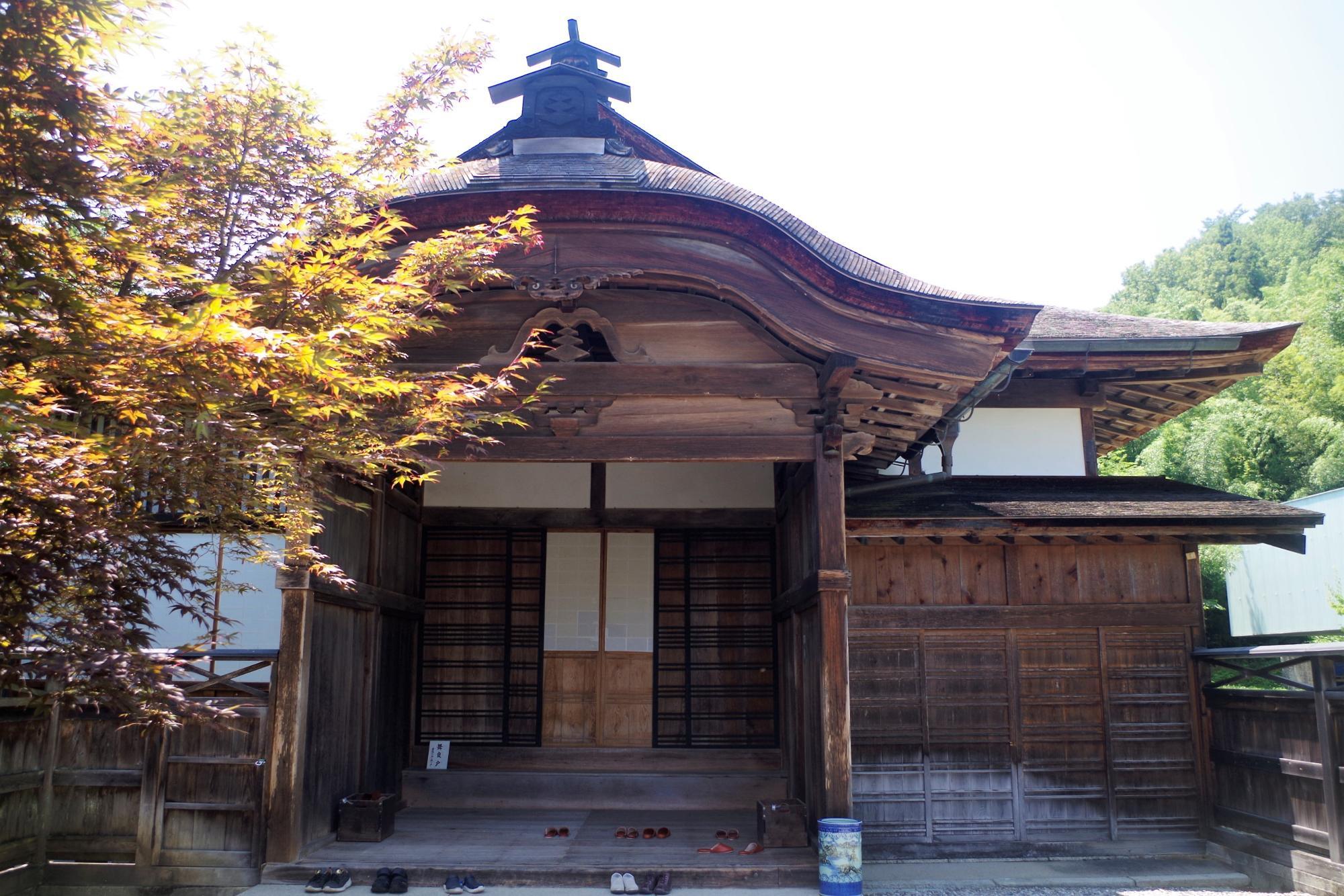 立派な向唐破風造(むこうからはふづくり)の屋根装飾が印象的です。屋根はこけら葺になっていて、虹梁(こうりょう)と呼ばれる虹のようなアーチを描いた梁の上に小笠原家の家紋・三階菱(さんかいびし)のあしらいが見えます。名家の建物だけあって手が込んでますね!
