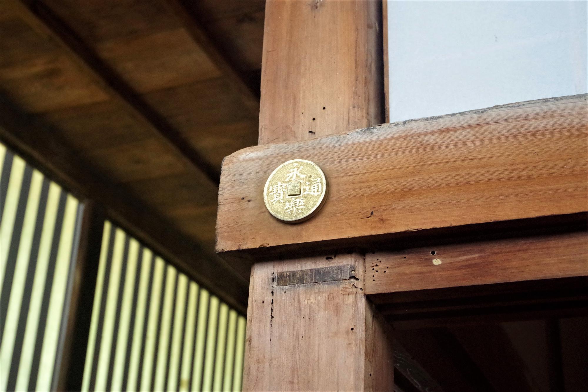 下の写真は、中国から輸入され、室町時代から江戸時代初頭にかけて関東地方で流通していたという通貨「永楽通宝」のデザインをモチーフにした釘隠し。現代的には、室内インテリアにお金のモチーフを使うのはちょっとありえない気がしますが、当時はおしゃれだったのか…他の意図があったのか…想像してみるのも楽しいですね。