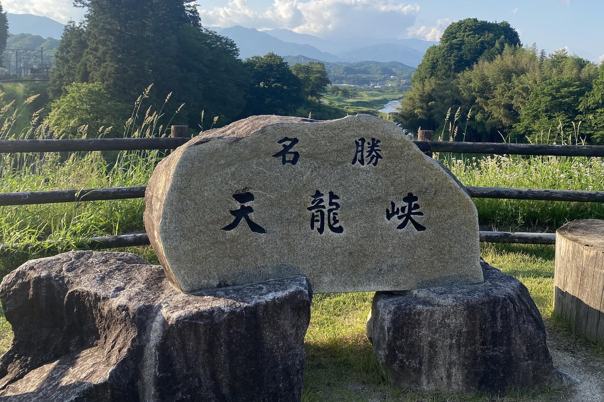 JR天竜峡駅すぐの場所にある天龍峡姑射橋広場にある石碑と一緒に記念撮影、というのも良いですね。