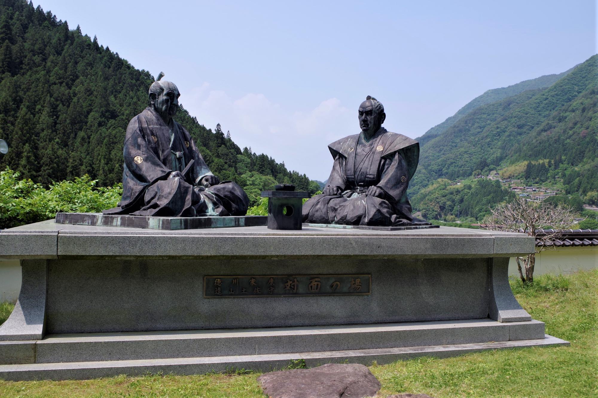 この徳川家康像は、和田城2代目領主の遠山土佐守景直(とおやまとさのかみかげなお)と対になった座像。南信濃村の発足30周年を記念して1990年に造成されたものです。