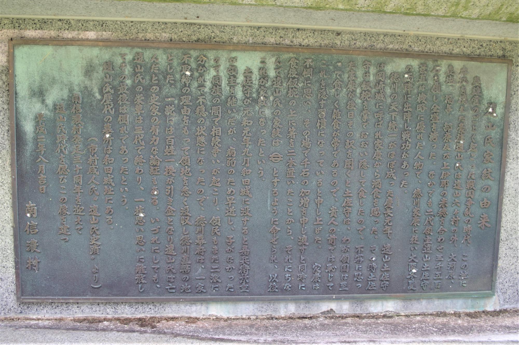 (銅像の土台に記された資料から抜粋)徳川の天下統一がほぼ成った慶長元年、遠山土佐守は岡崎城に呼ばれ家康から酒食を賜った。その時土佐守は飯椀を掌で覆い隠して食したので、不審に思った家康が後日そのわけを聞くと土佐守は、わが領国は至って貧しく雑食が常であるので、貴人の前では恥じてこれを隠す習慣になっていると申し上げた。家康は、不憫に思い、その場で千石の加増を申し渡すと同時に食後飯椀の上に箸を二本置いたことから、それにちなんで遠山氏の家紋は【表示できない記号 ※丸に出二つ引き紋に似た形、〇に=が重なる図案、=は〇から突き出している)】とするように命ぜられ、以後これが家紋になったという。