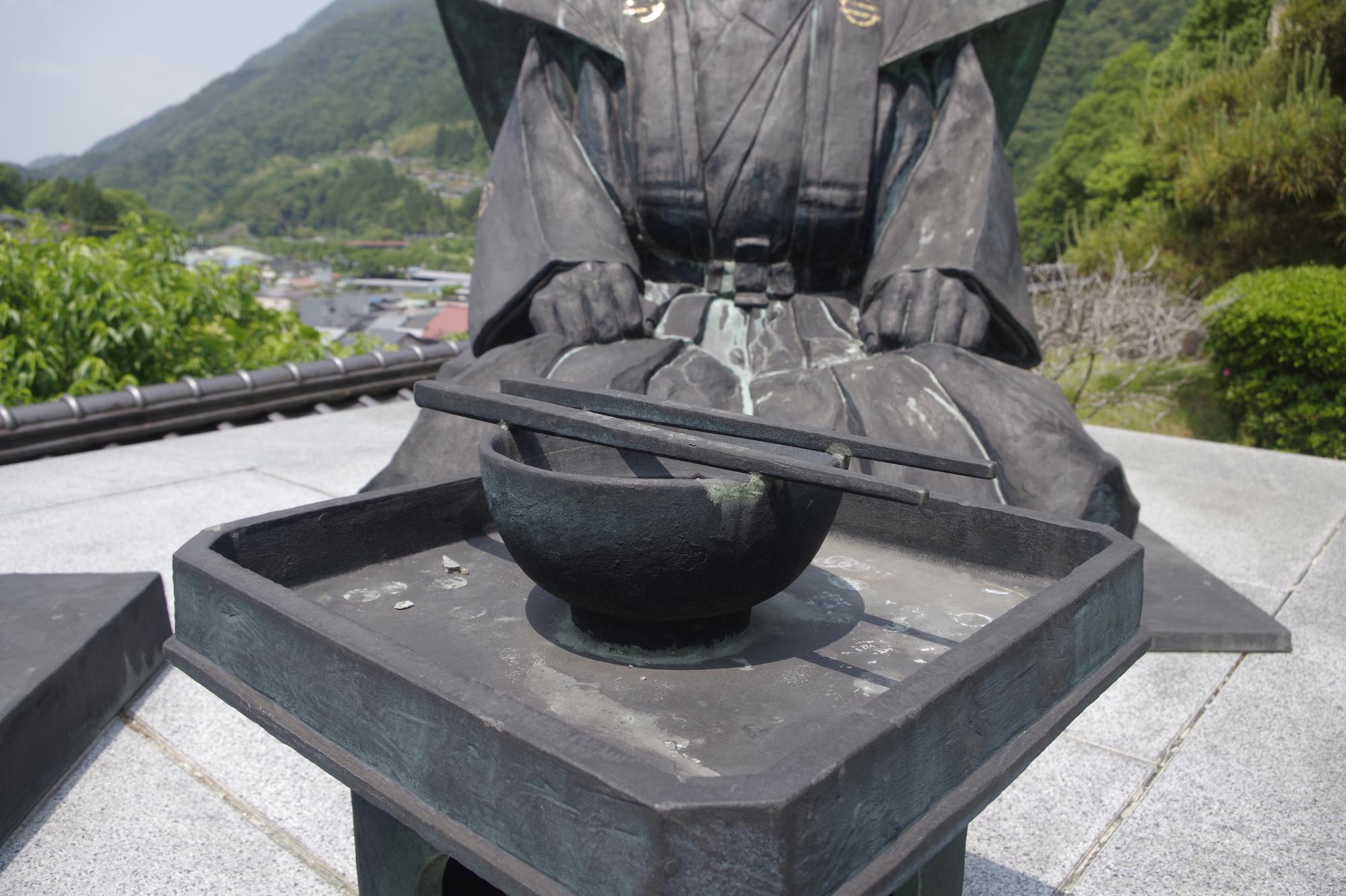 銅像の徳川家康と遠山土佐守の間にある、椀の上に箸を渡した状態の飯椀が家紋の原型。銅像の土台部分には詳しいエピソードが記されていました。