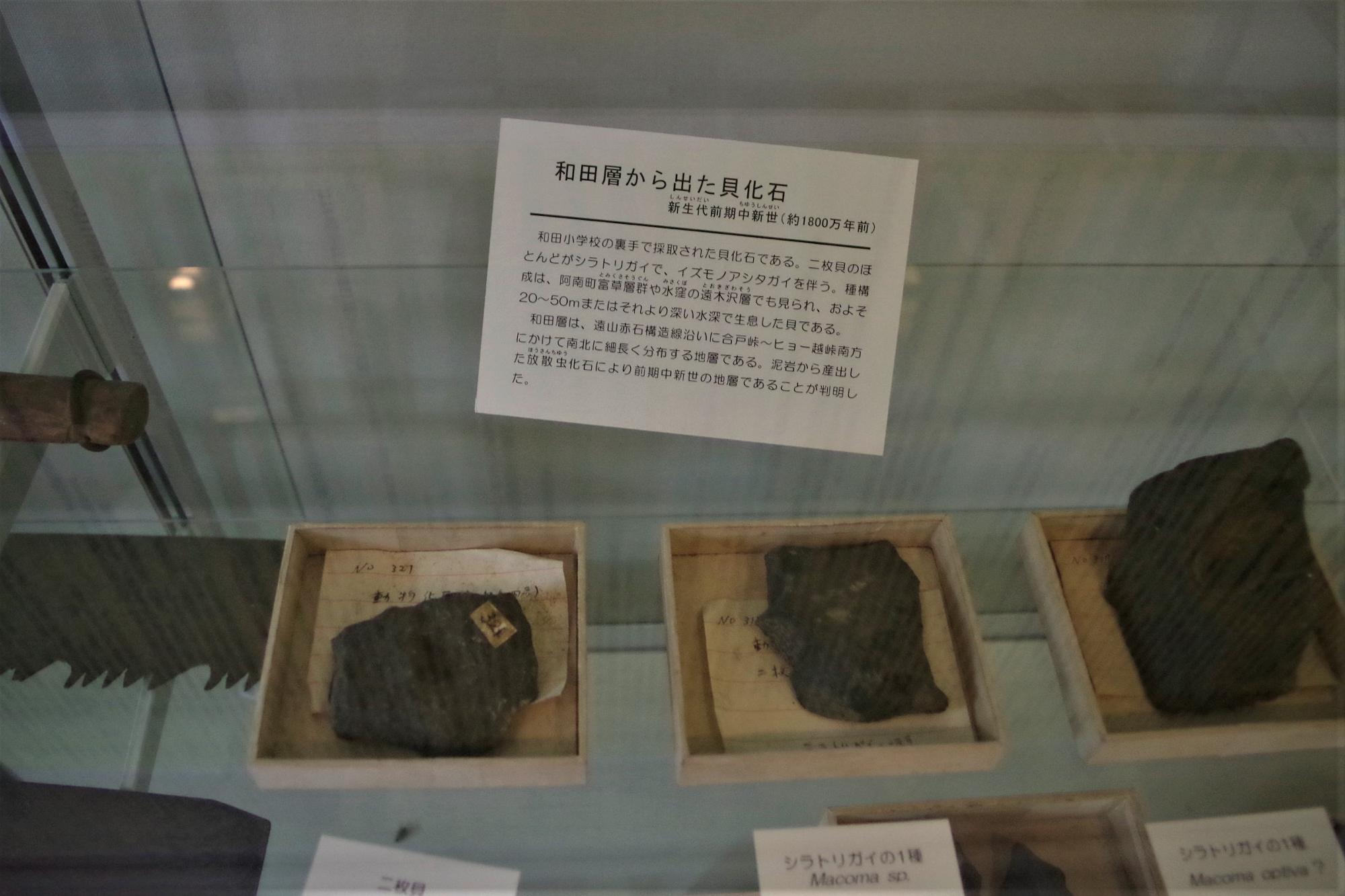 3階では、石器や土器などの出土品や化石を中心にした品々が展示されていました。