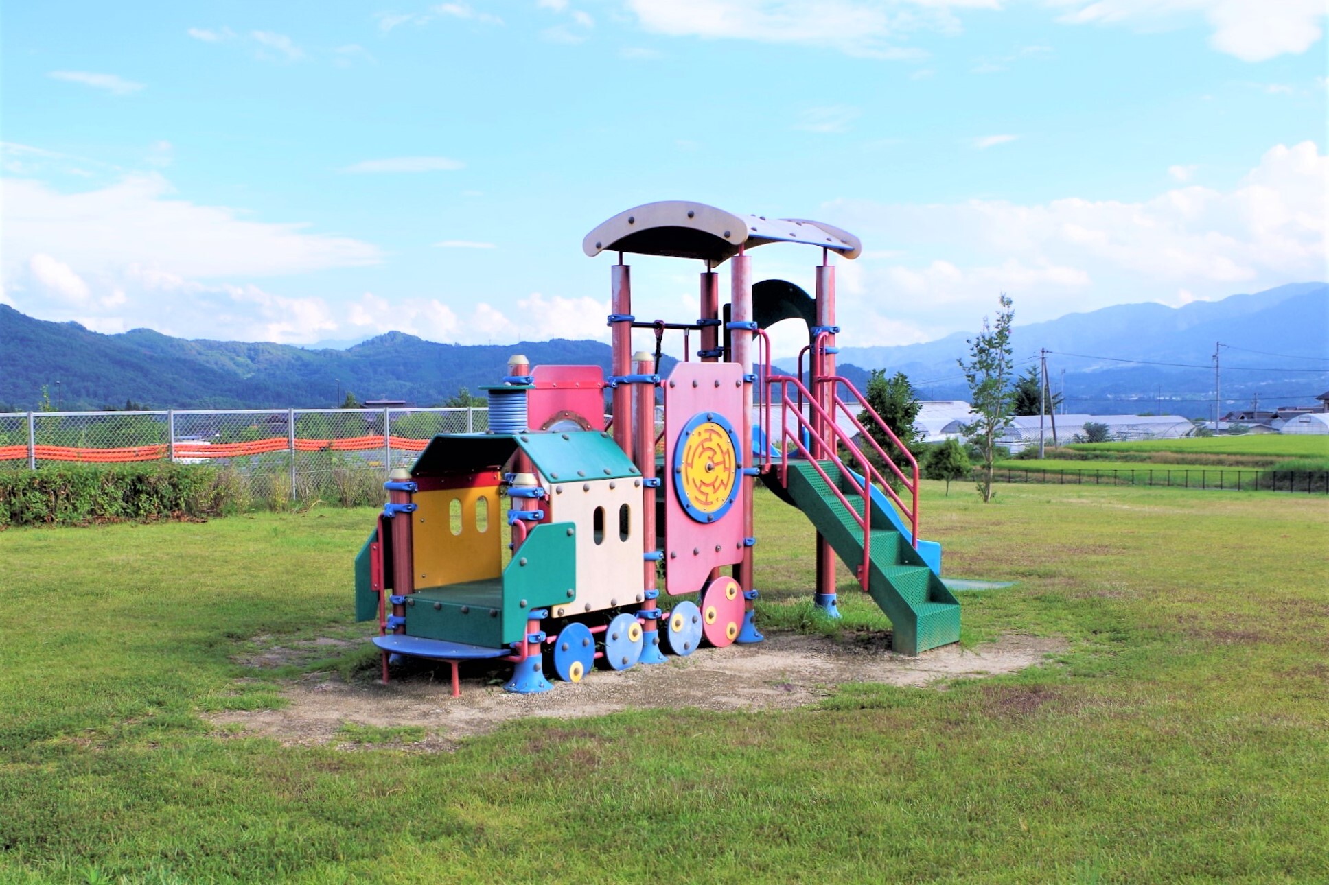 とくに目立った施設や大型遊具があるわけではないのですが、見晴らしの良さと解放感が魅力。周囲には広大な田園、中央アルプス、南アルプスまで見渡すことができる清々しい景色が広がっています。