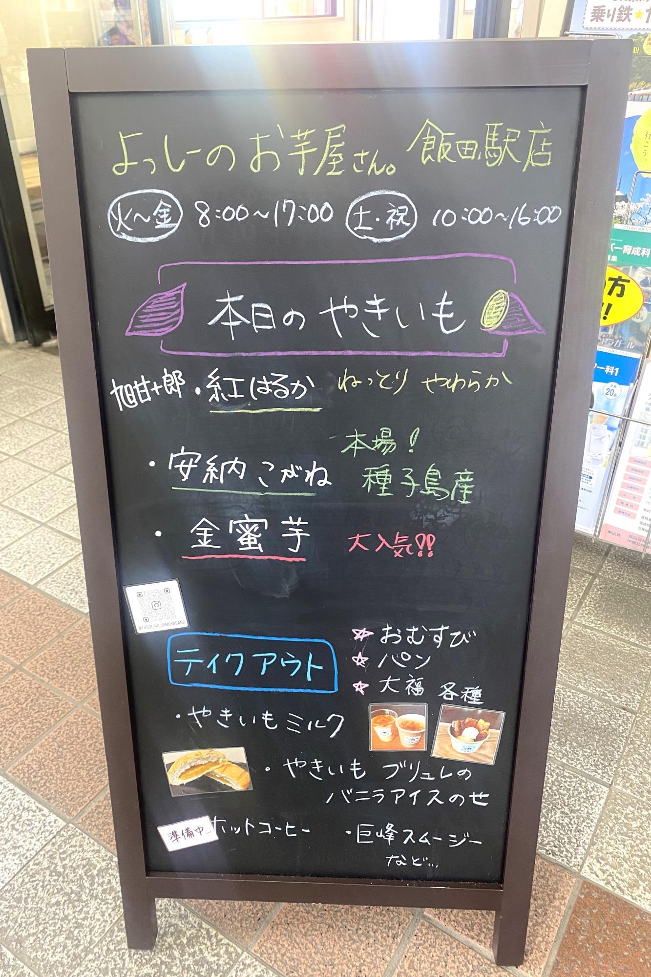 今回は、2024年2月3日にJR飯田駅待合室内にOPENしたよっしーのお芋屋さん。飯田駅店へ行ってきました。
