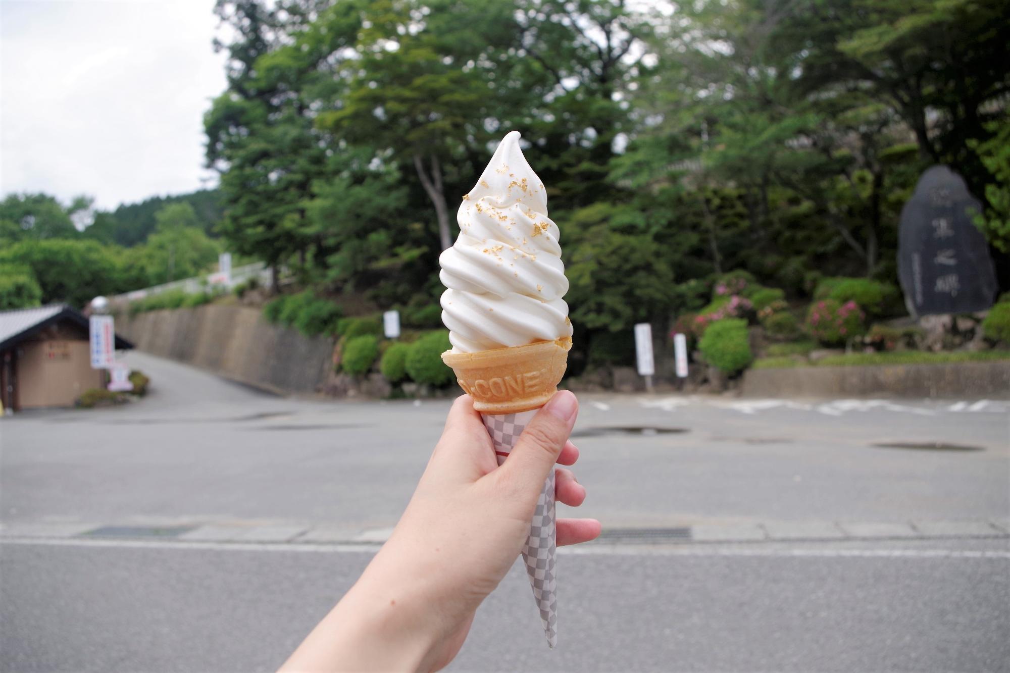 店頭ではソフトクリームの販売も。今回いただいた金箔ソフトクリームは400円、プレーンタイプのソフトクリームは300円となっています。